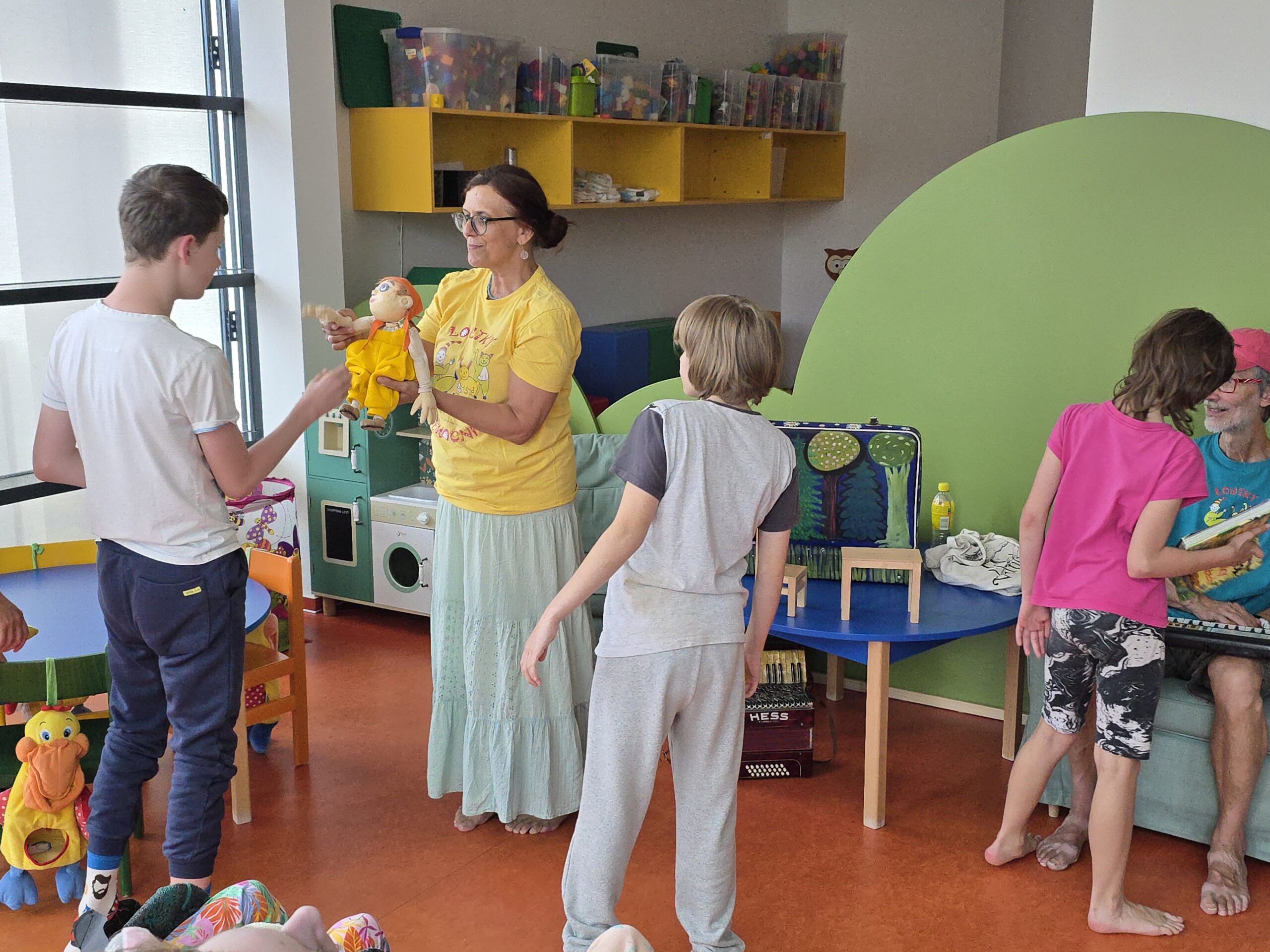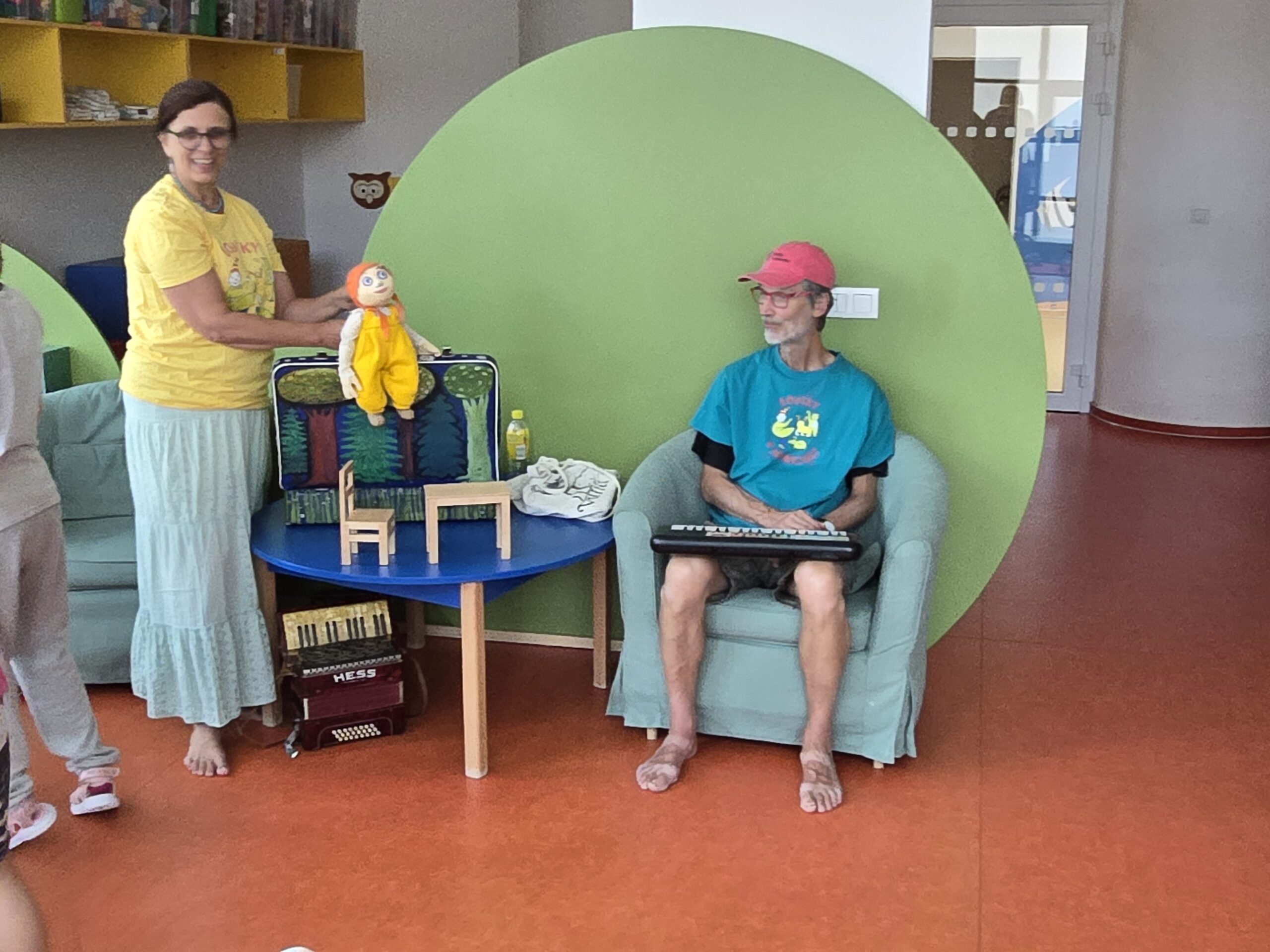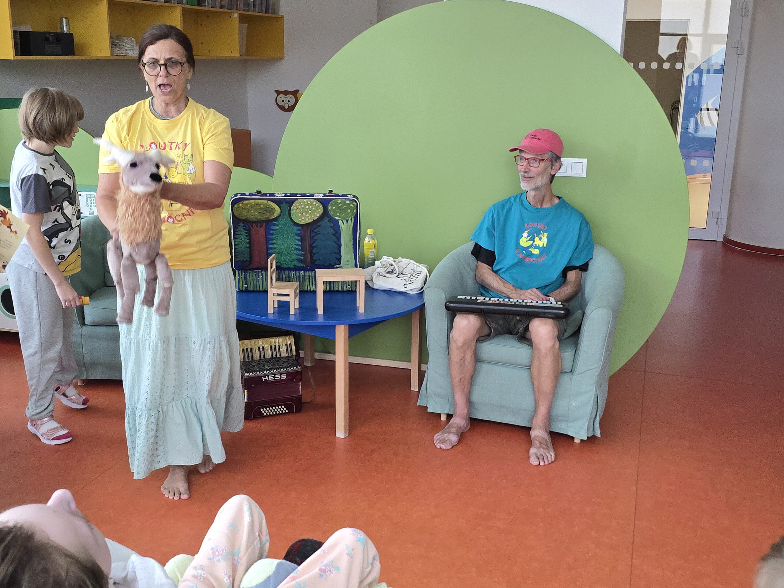 Na herně bylo díky nim zas veselo, dokonce se tentokrát i tančilo! Pohádka byla o Budulínkovi a jeho jelenovi, který se rozběhl kolem všech dětí. Budulínek si prohlédl, jakou barvu mají oči všech dětí a naučil se jejich jména. A mezi tím se zpívalo a tančilo. Zazpívali jsme si repertoár dětských písní, písní pana Svěráka, Šípa a Uhlíře a písně pohádkové. Děkujeme za takovou milou návštěvu a atmosféru, kterou jste u nás zanechali.