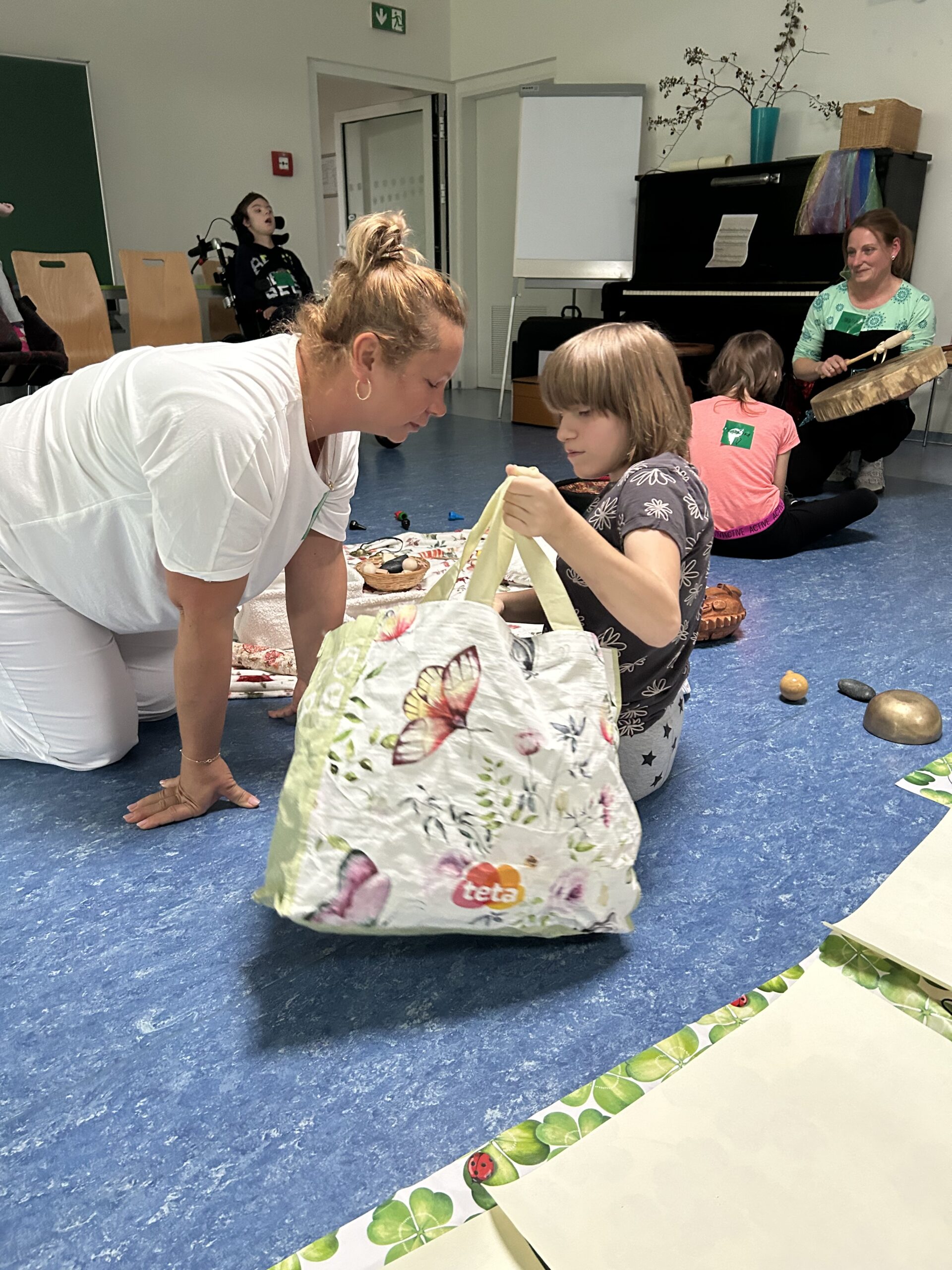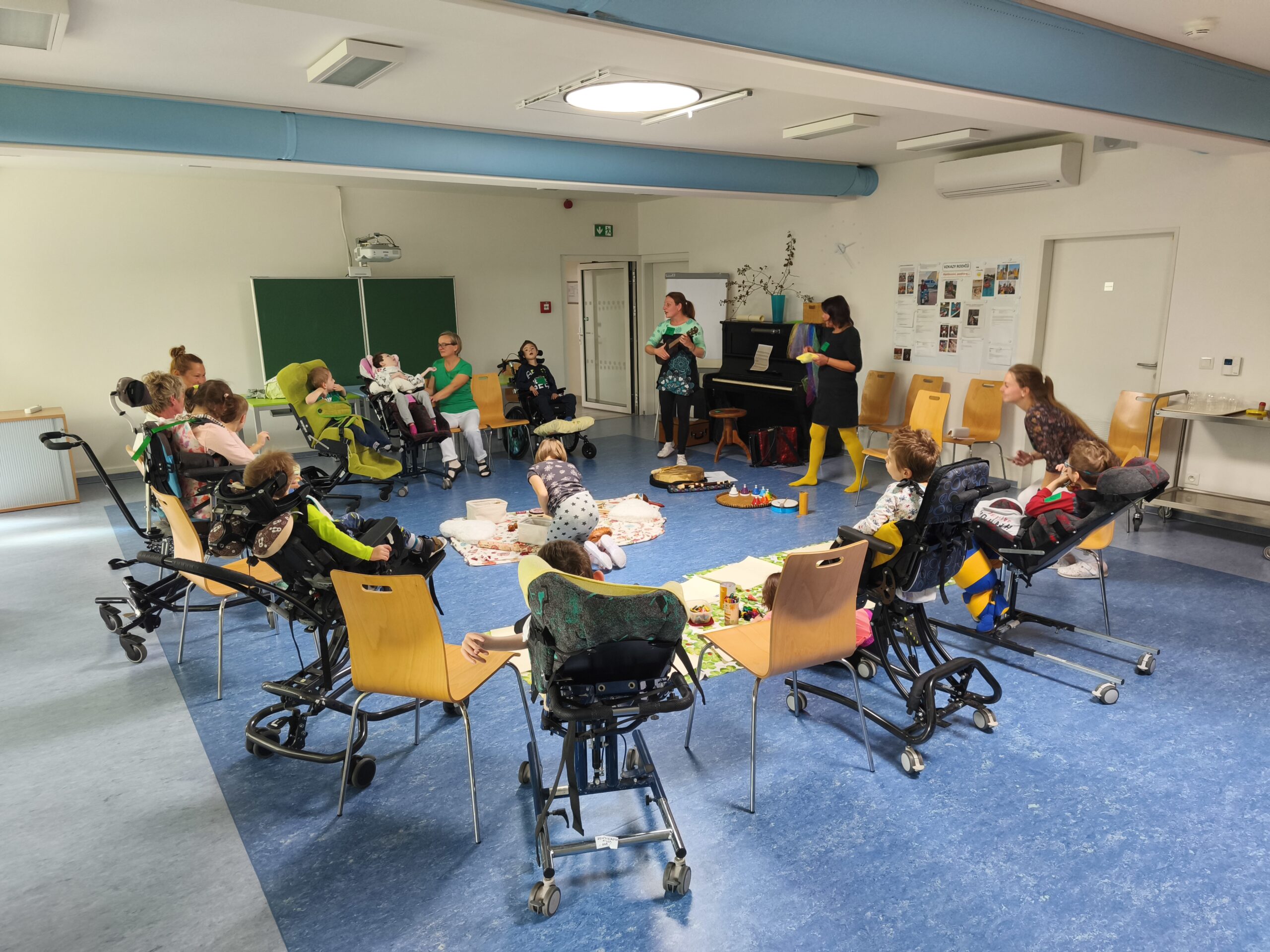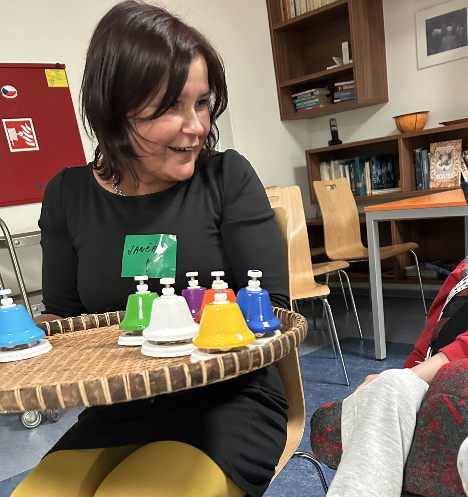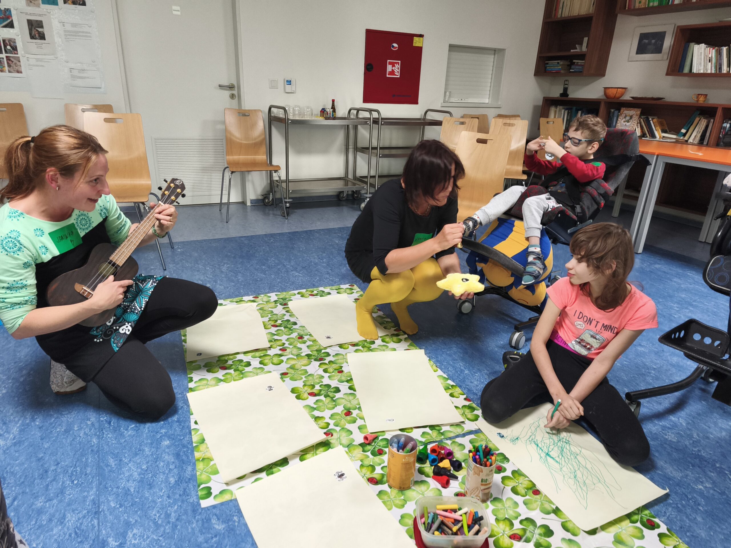 Po svačině se děti setkaly ve velké jídelně, kde na ně čekal zajímavý program. Měly možnost poslouchat zvuky flétny, harmoniky, piána, ukulele, orfových rytmických nástrojů (triangl, rumbakoule, atd.) a dalších nevšedních nástrojů. V úvodu proběhlo představování dětí, terapeutů i personálu. Za doprovodu hudby si děti dokonce mohly i něco namalovat. Jedna z dam se věnovala více dětem , druhá vytvářela atmosféru i personálu. Všichni společné chvíle vnímali jako příjemnou relaxaci, která jim vykouzlila úsměv na rtu.