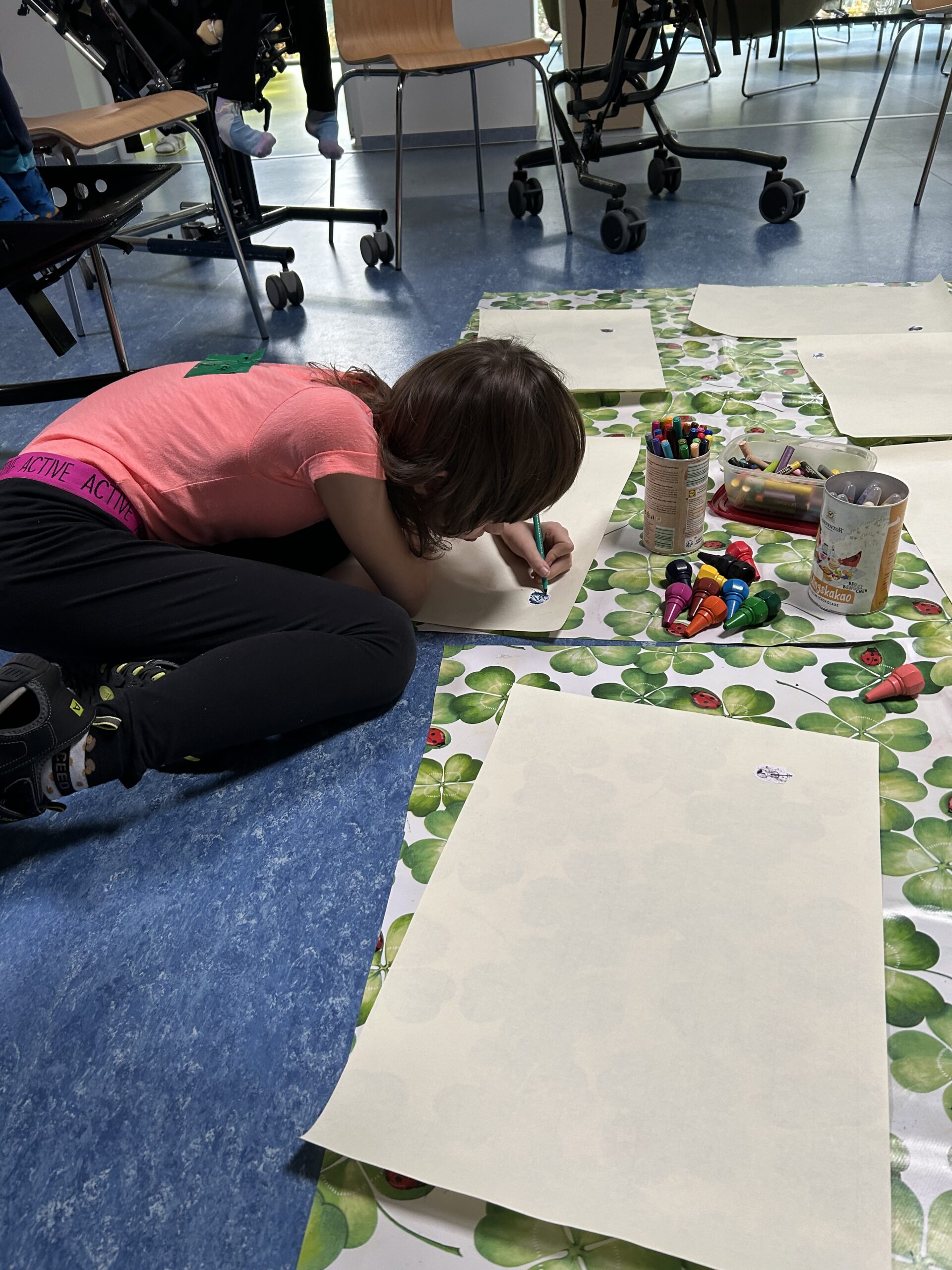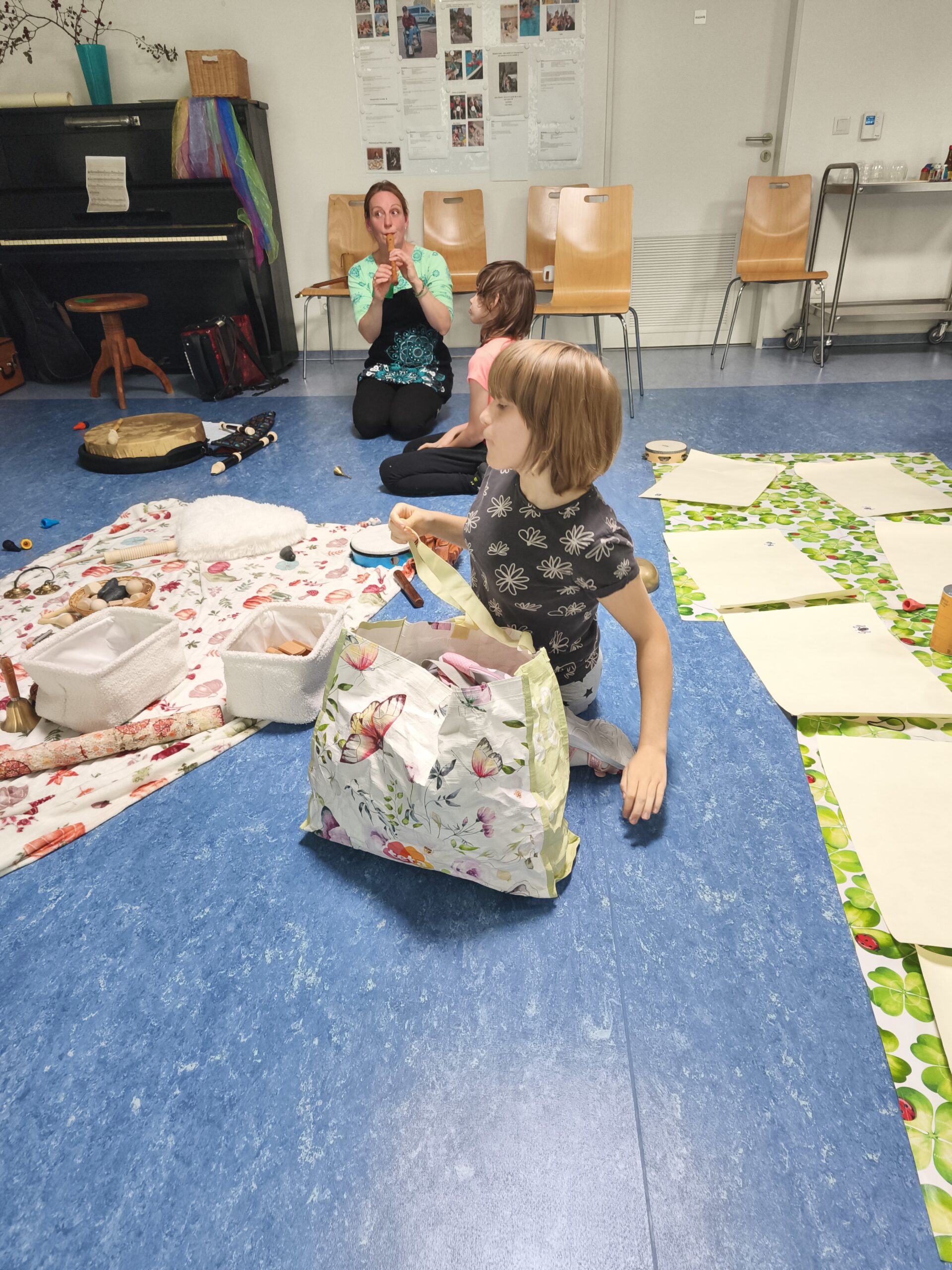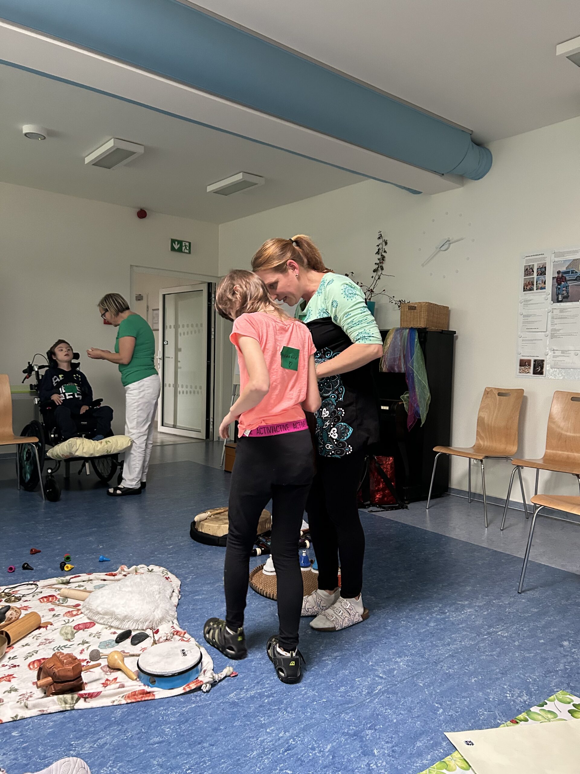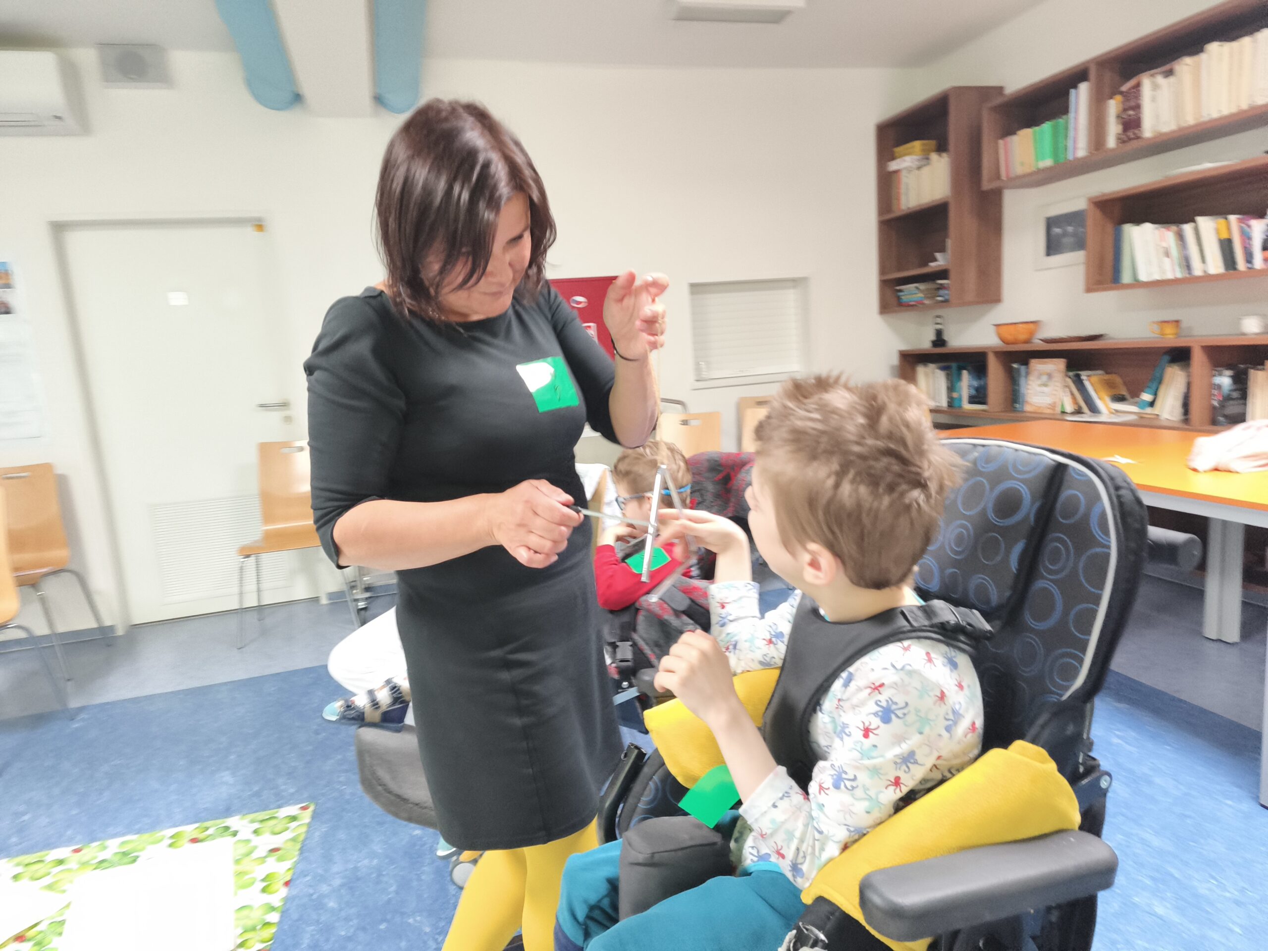 Po svačině se děti setkaly ve velké jídelně, kde na ně čekal zajímavý program. Měly možnost poslouchat zvuky flétny, harmoniky, piána, ukulele, orfových rytmických nástrojů (triangl, rumbakoule, atd.) a dalších nevšedních nástrojů. V úvodu proběhlo představování dětí, terapeutů i personálu. Za doprovodu hudby si děti dokonce mohly i něco namalovat. Jedna z dam se věnovala více dětem , druhá vytvářela atmosféru i personálu. Všichni společné chvíle vnímali jako příjemnou relaxaci, která jim vykouzlila úsměv na rtu.