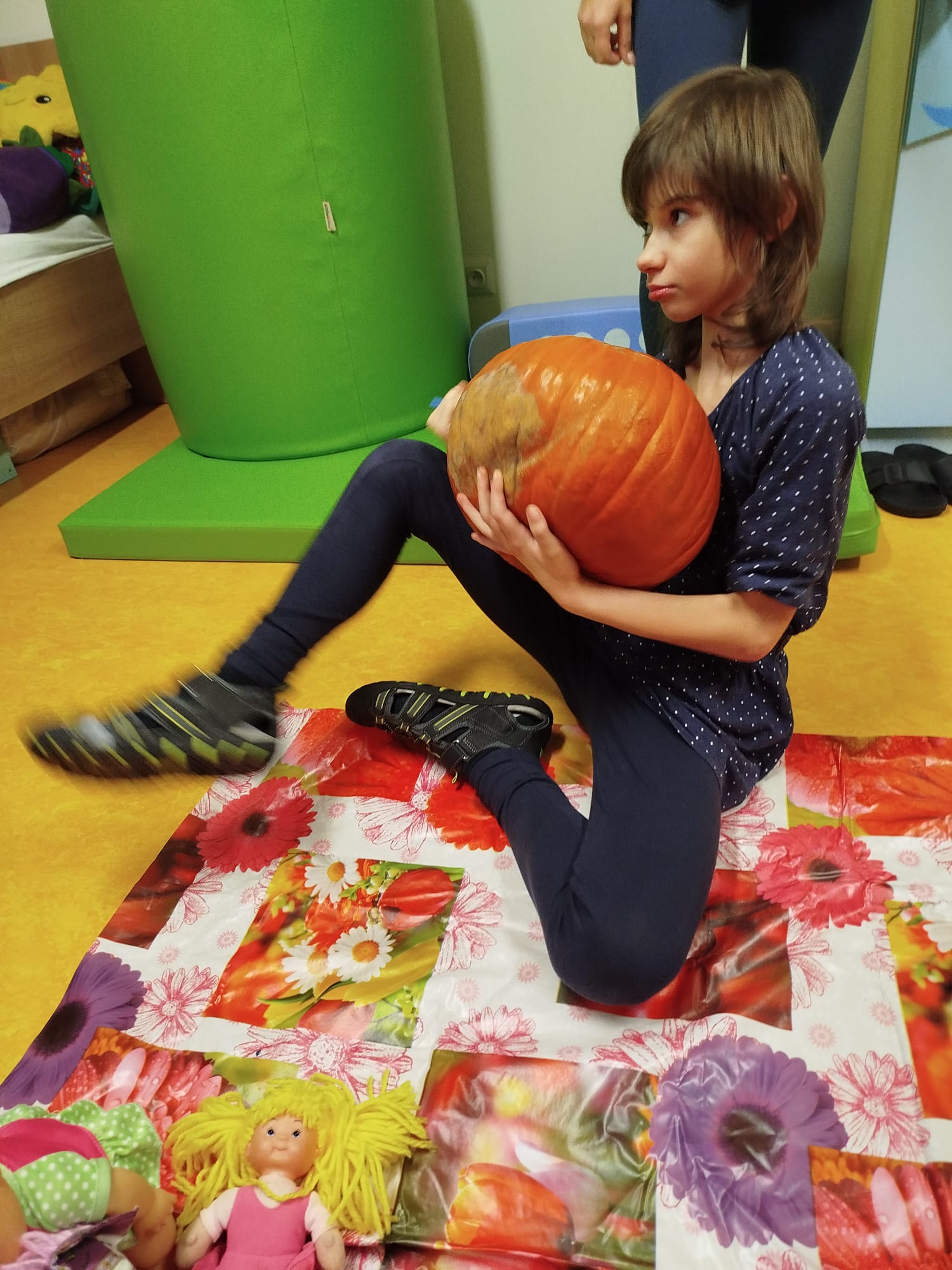 V rámci školní výuky dětí proběhla tradiční podzimní aktivita, kterou mají děti moc rády. Společnými silami, s pomocí pedagogů a asistentů si děti užily oranžovou barvu dýně, její vůni, tvar, tvrdost a semínka. Ano, všechny smysly děti v rámci této aktivity zapojily. A vznikl opět originální „dýňák“, který zdobí vstup do dětského centra v Choceradech.