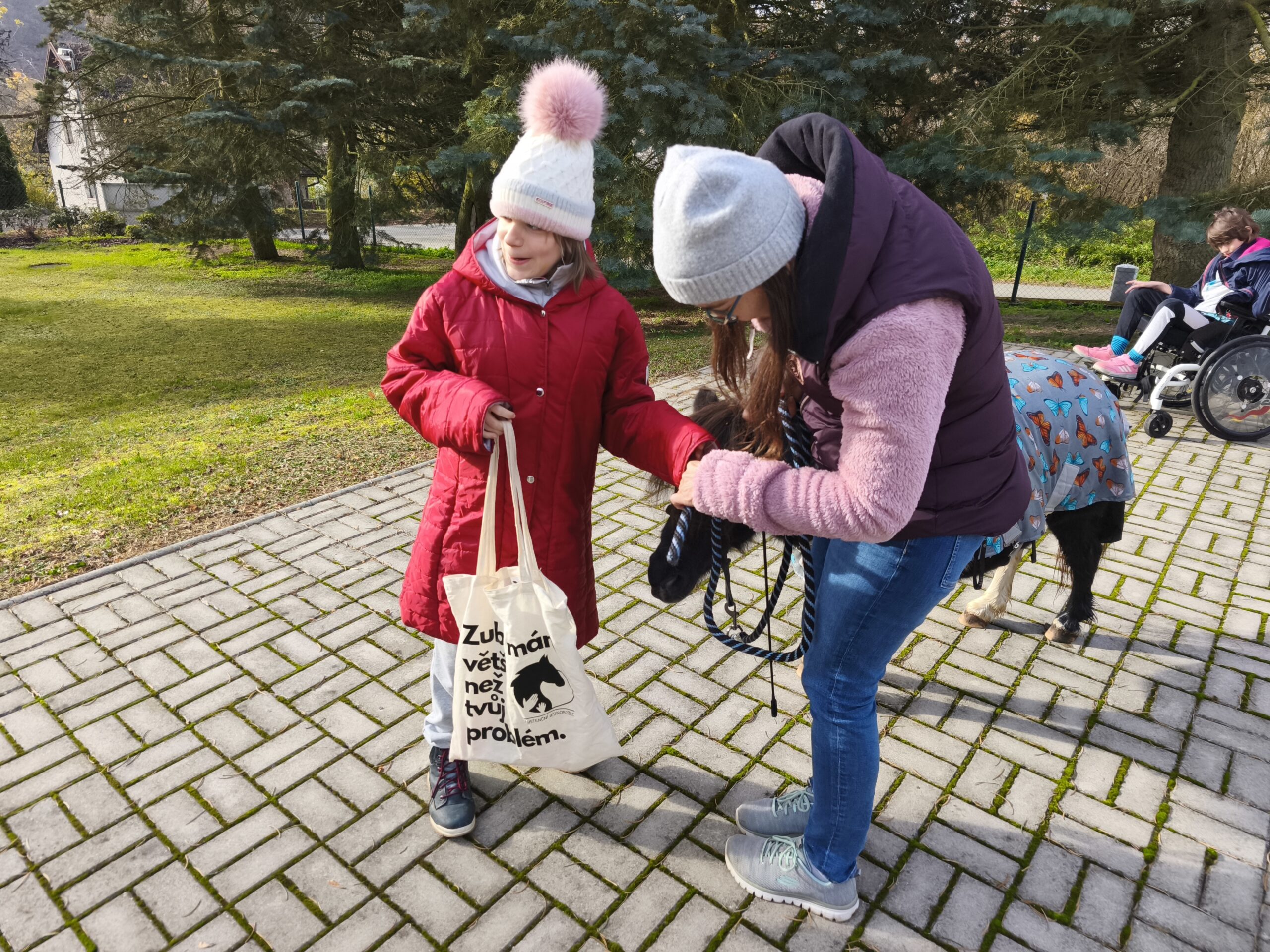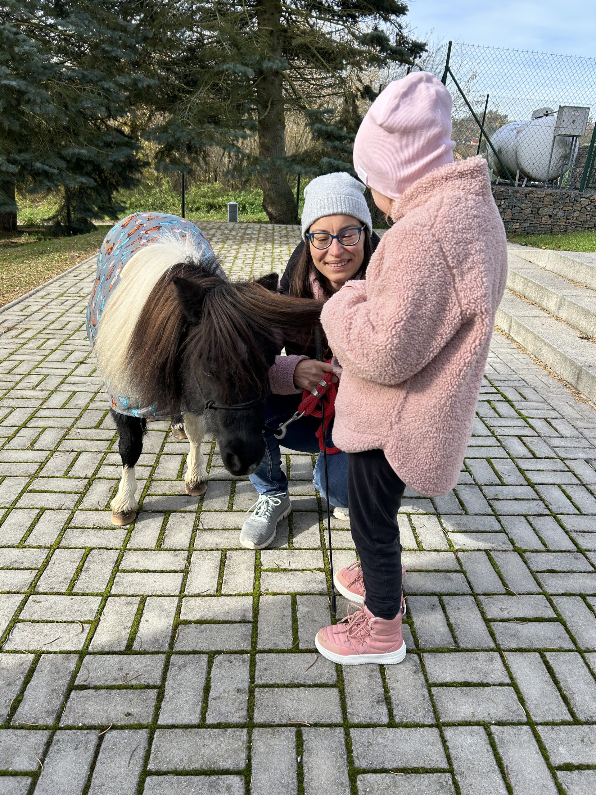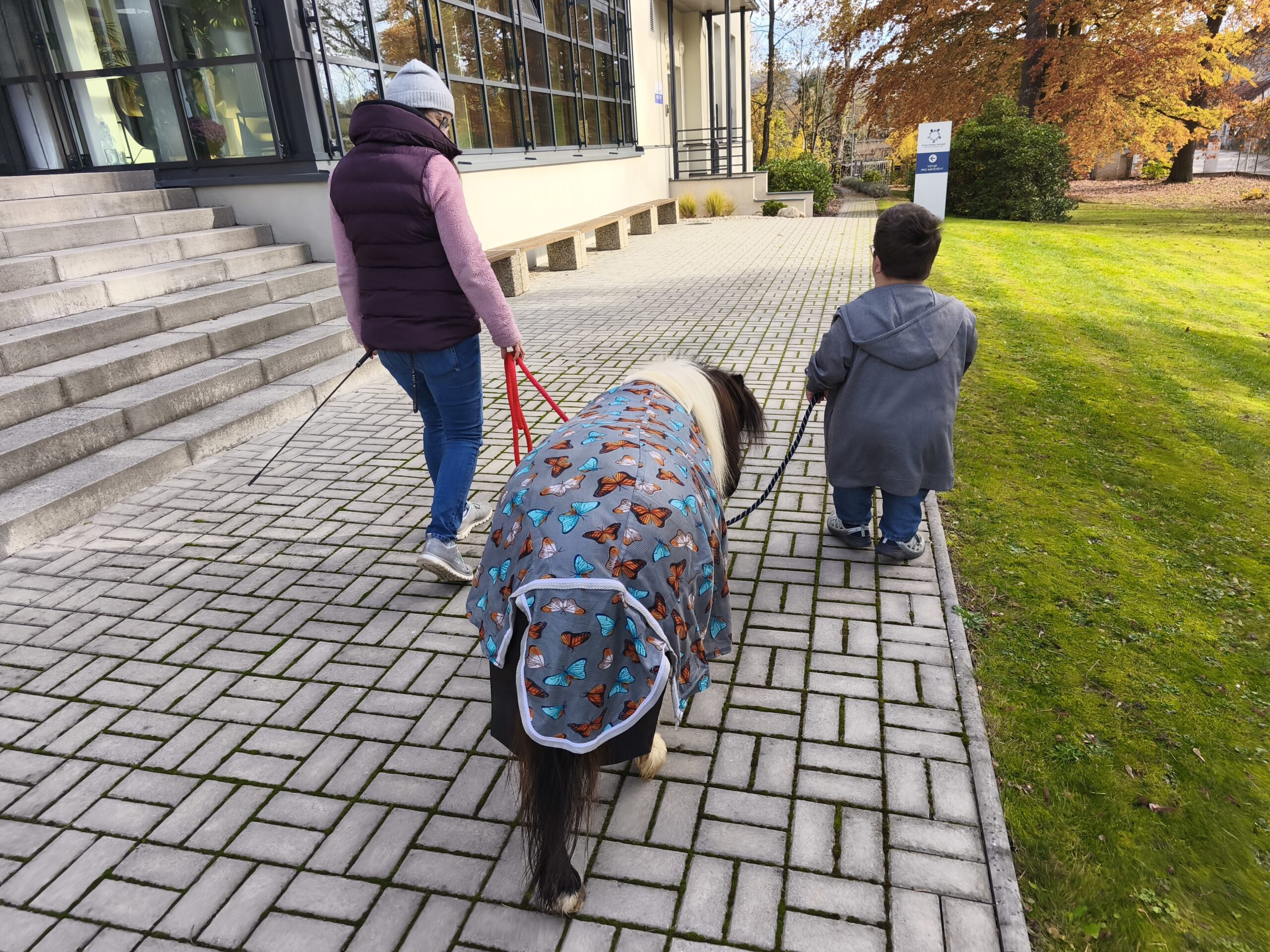 I když si počasí vyžádalo teplejší oblečení, vyrazily dnes děti s Elinkou poprvé i mimo areál dětského centra Chocerady. Někteří zdatní chodci se podívali opravdu daleko. Klapání kopýtek o asfaltové plochy děti rády poslouchají a užívají si, že samostatně drží vodítko. Paní Veronika vše sleduje a hlídá, aby se dětem ani Elince nic nestalo. Došlo i na hlazení a pročesávání husté hřívy koníka. Děkujeme za další krásné koňské setkání!!!