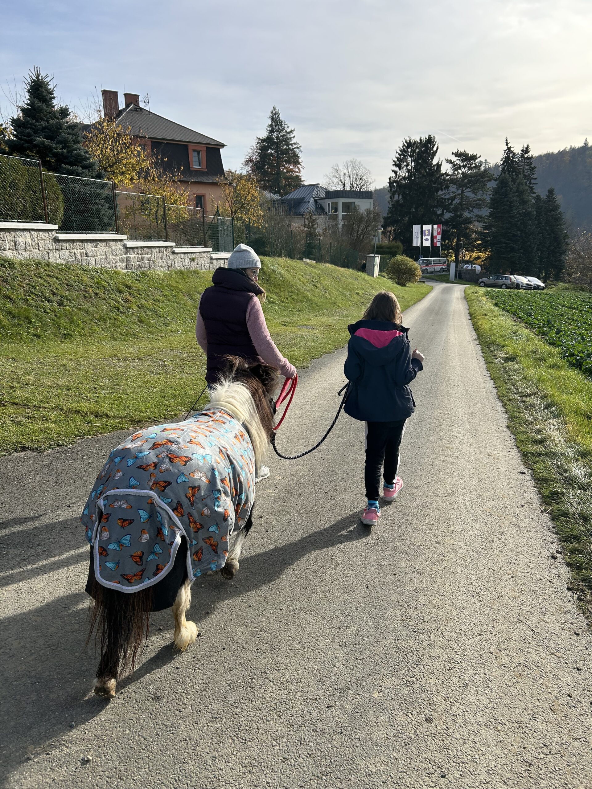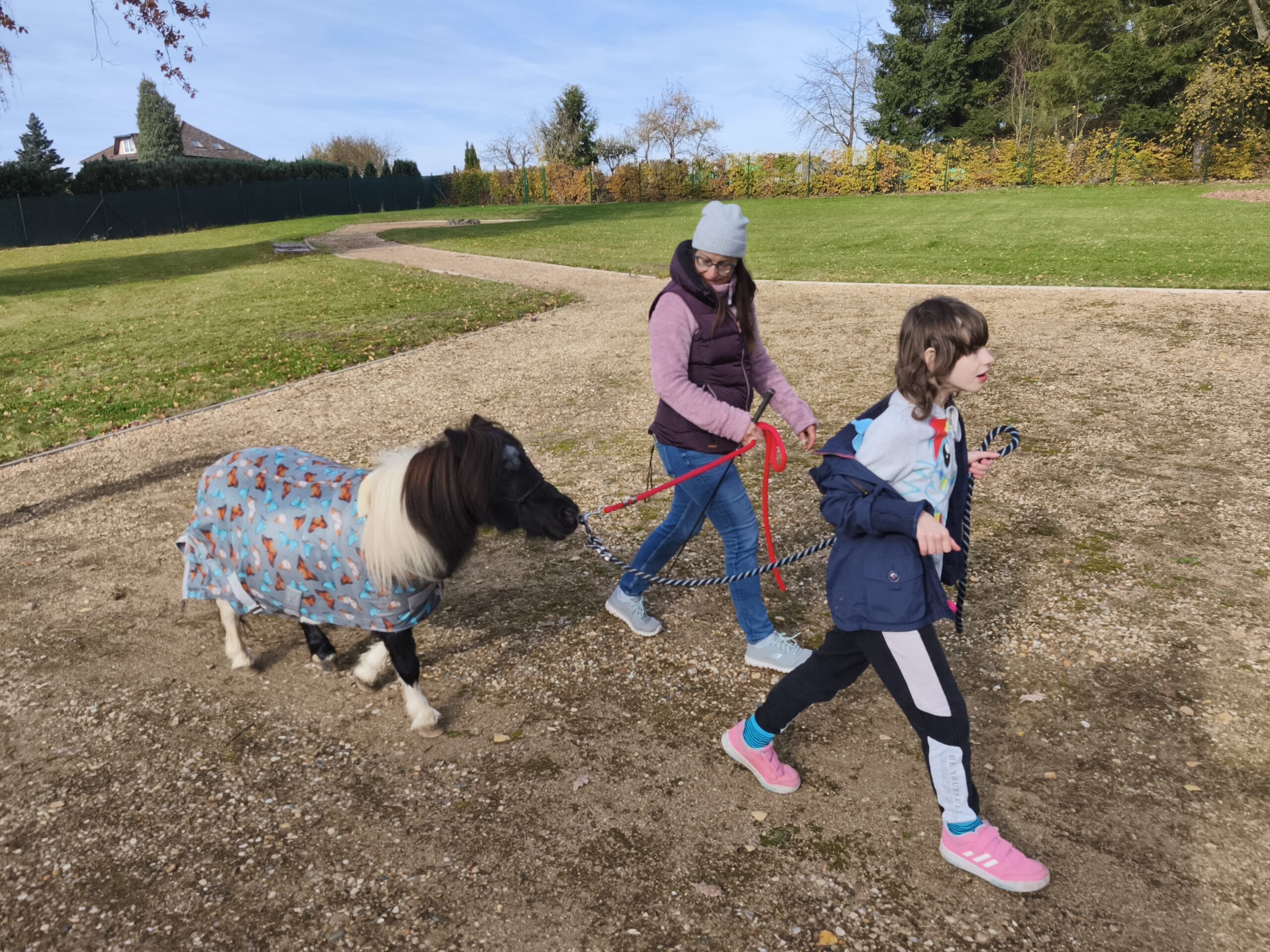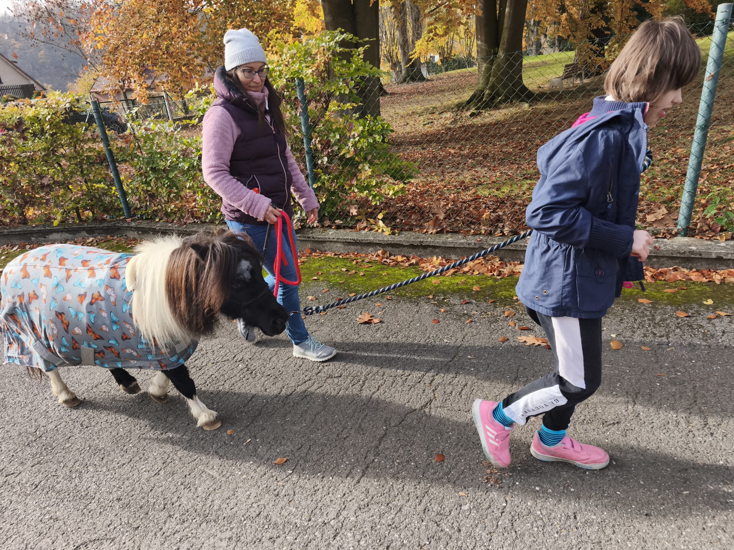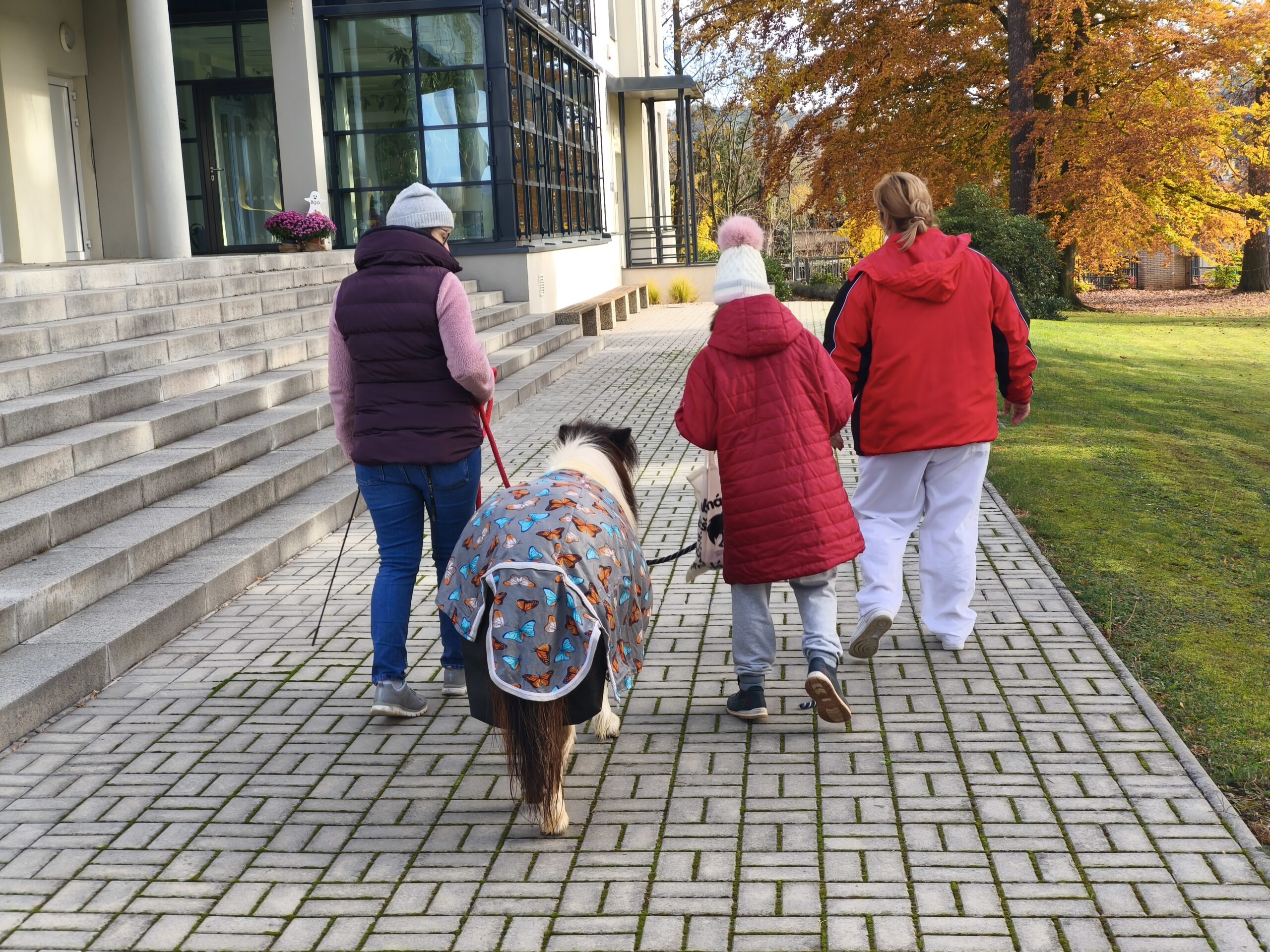 I když si počasí vyžádalo teplejší oblečení, vyrazily dnes děti s Elinkou poprvé i mimo areál dětského centra Chocerady. Někteří zdatní chodci se podívali opravdu daleko. Klapání kopýtek o asfaltové plochy děti rády poslouchají a užívají si, že samostatně drží vodítko. Paní Veronika vše sleduje a hlídá, aby se dětem ani Elince nic nestalo. Došlo i na hlazení a pročesávání husté hřívy koníka. Děkujeme za další krásné koňské setkání!!!