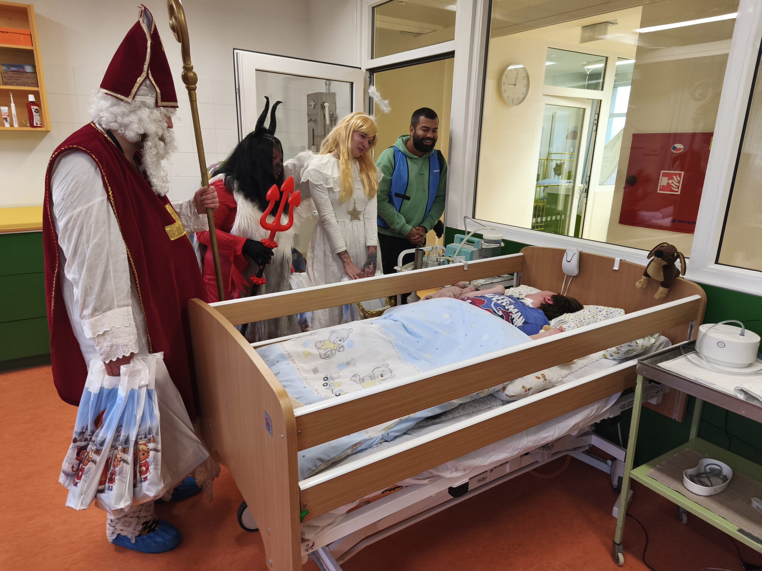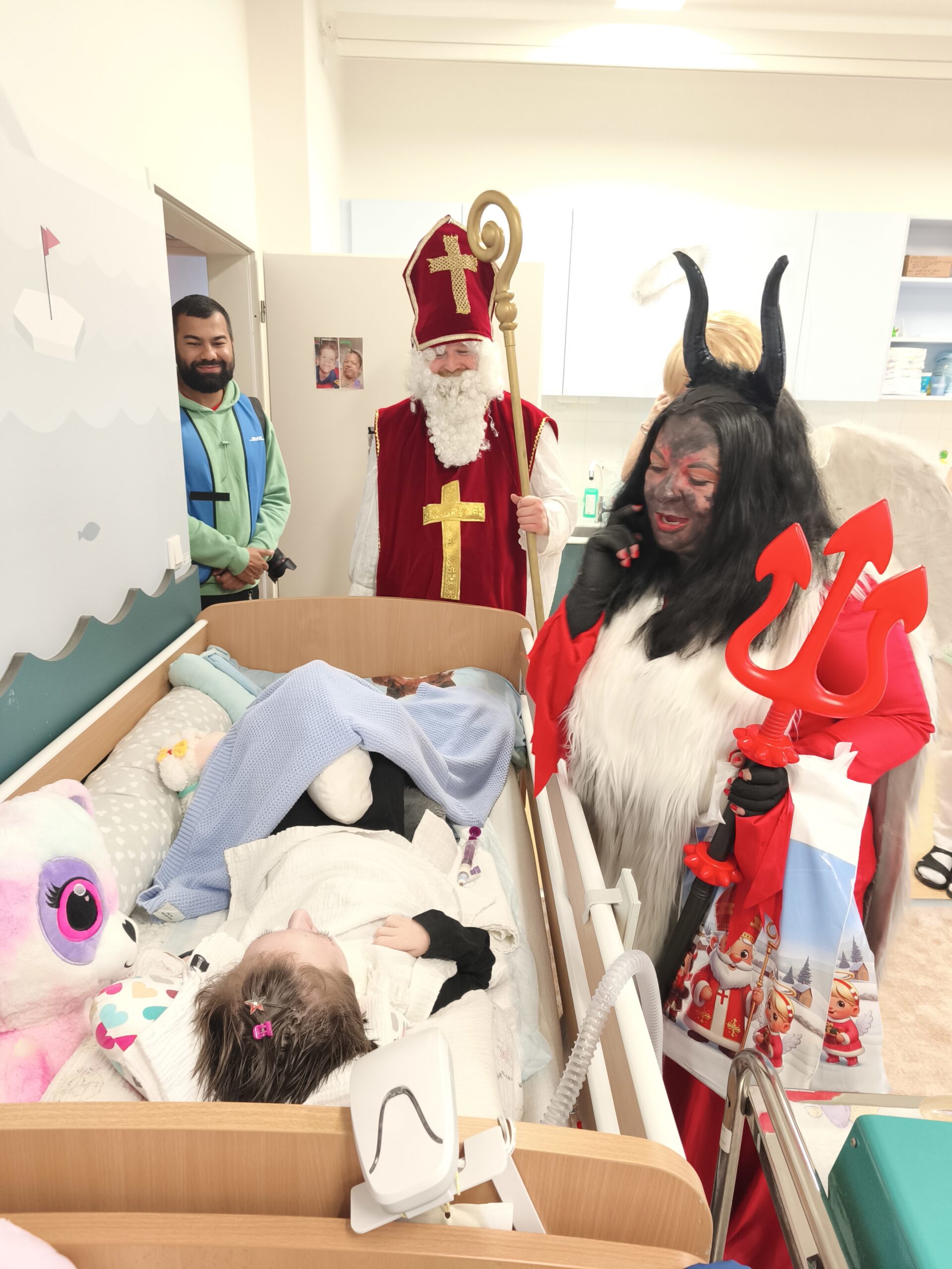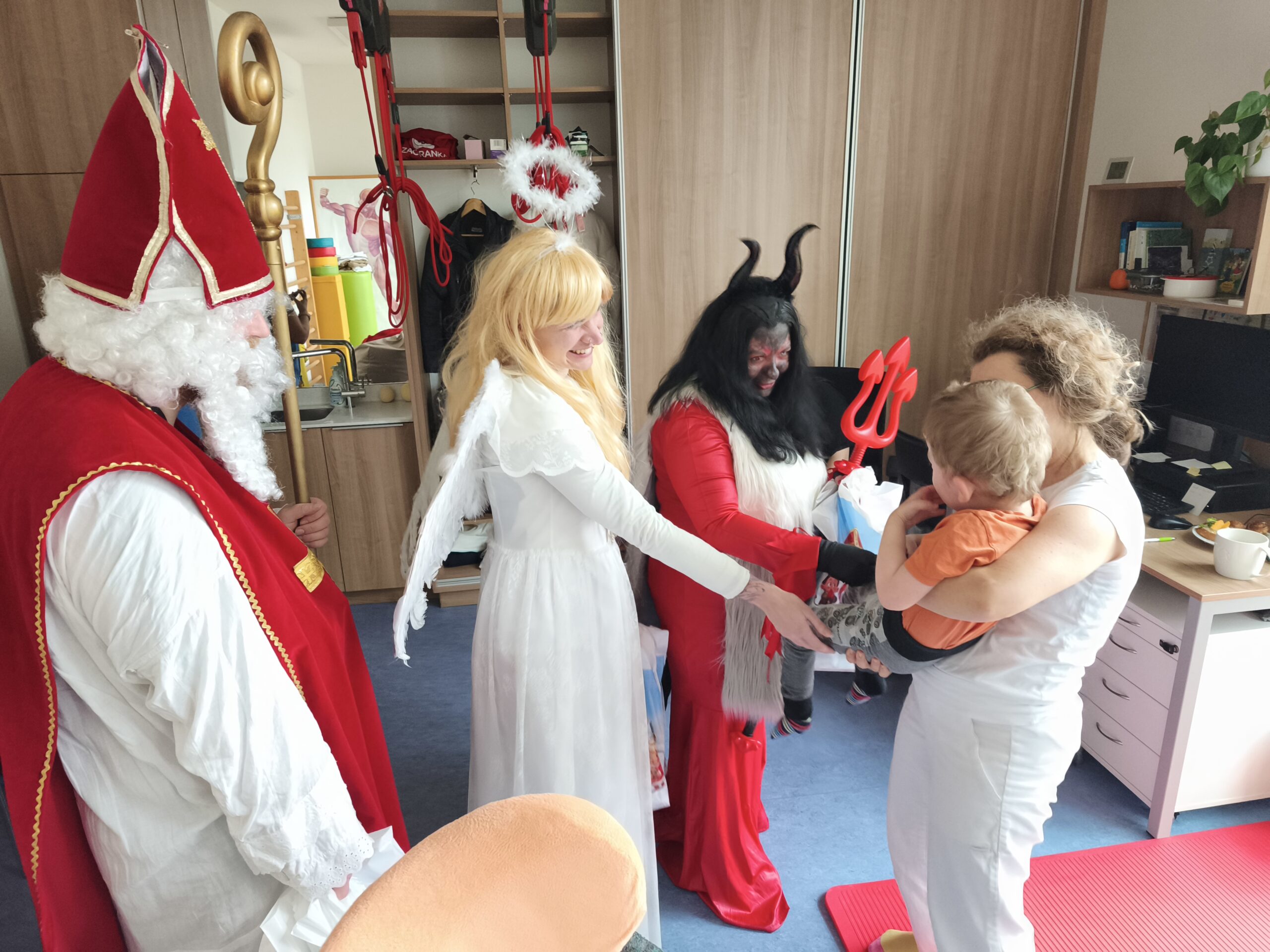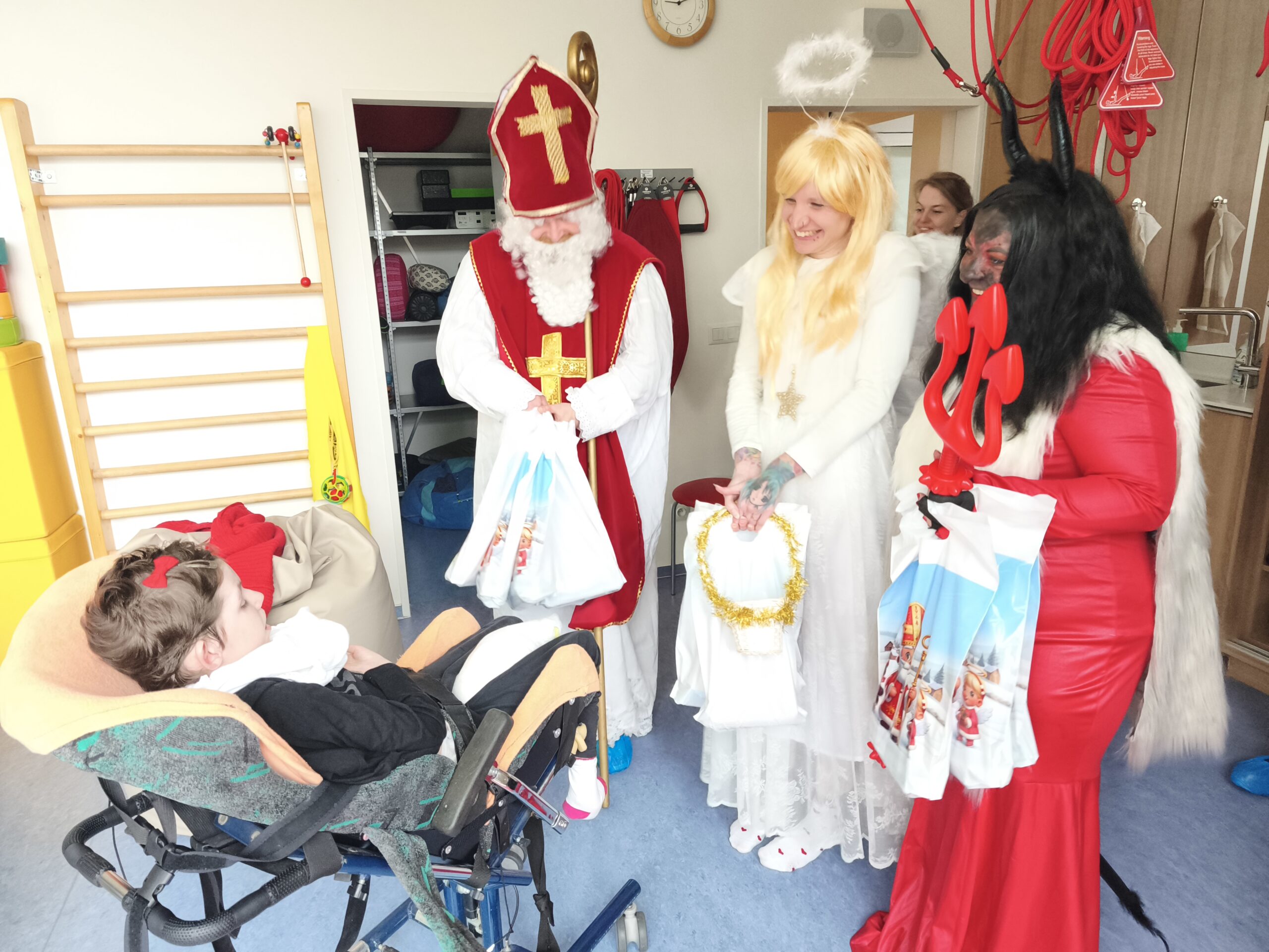 Už v minulém roce jsme si užili velmi autentické kostýmy. Letos jsme změnili koncept a Mikuláš procházel všechny pokoje dětí, hernu, rehabilitaci, učebny a postupně se potkával se všemi dětmi. Vzniklo mnoho veselých situací, takže jsme se společně moc zasmáli. Děti dostaly balíčky a užily si zas jednu nevšední atmosféru dne. Moc Vám za to děkujeme.
