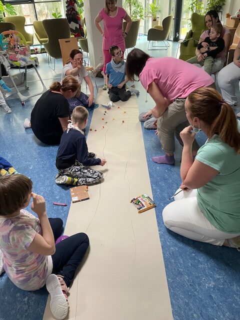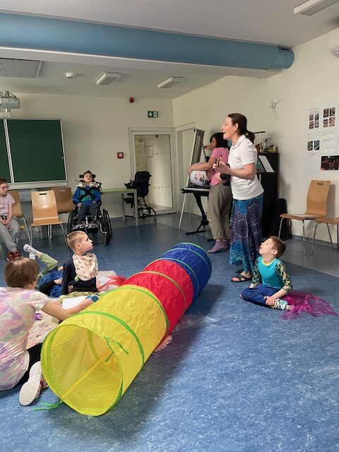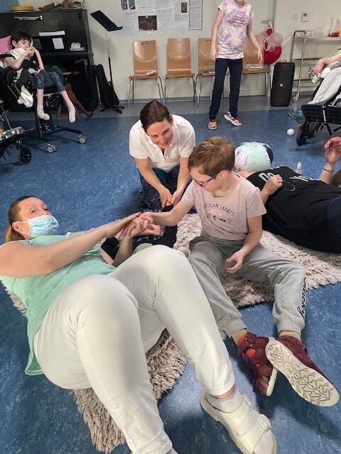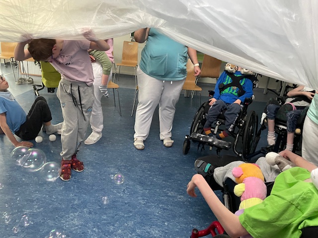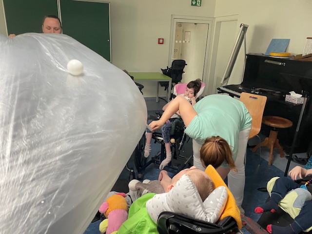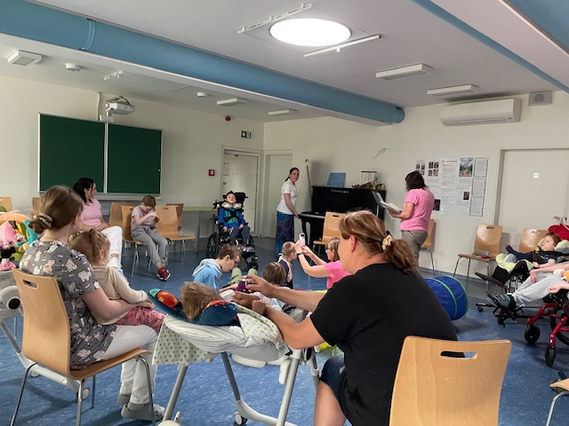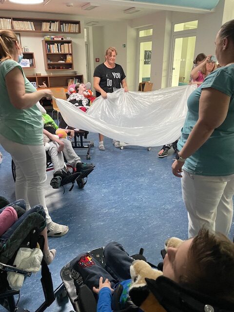 Zpívaly se písně z Ledového království. Používaly se tematické pomůcky a dekorace. Pracovníci s muzikoterapeutkami tančili s obřím pohádkovým nebem (igelitovou dekorací), na kterém měli balónky a ty se kutálely po celé ploše. Děti běhaly pod dekorací či pomáhaly s držením a pohybem balónků. Další příjemnou zábavou byly bublinky z bublifuku a společný tanec a zpěv. Také se malovalo na veliký papír, který byl umístěný na zemi. Společně vznikal krásný obrázek a namalovaná cesta od začátku až do konce papíru. Atmosféra byla opět moc příjemná a všichni měli úsměv na tváři, tak jako si to vždy přejeme.
