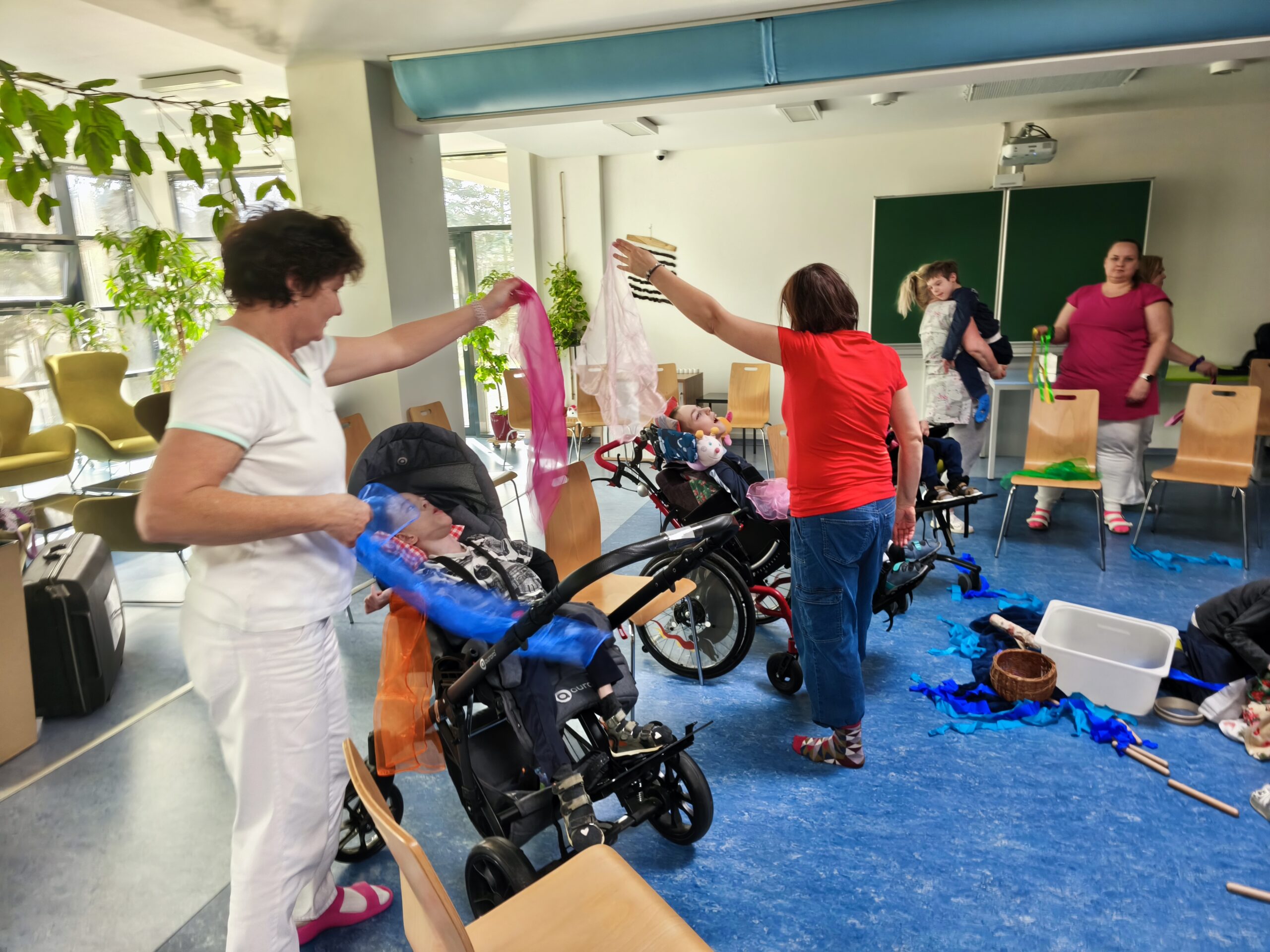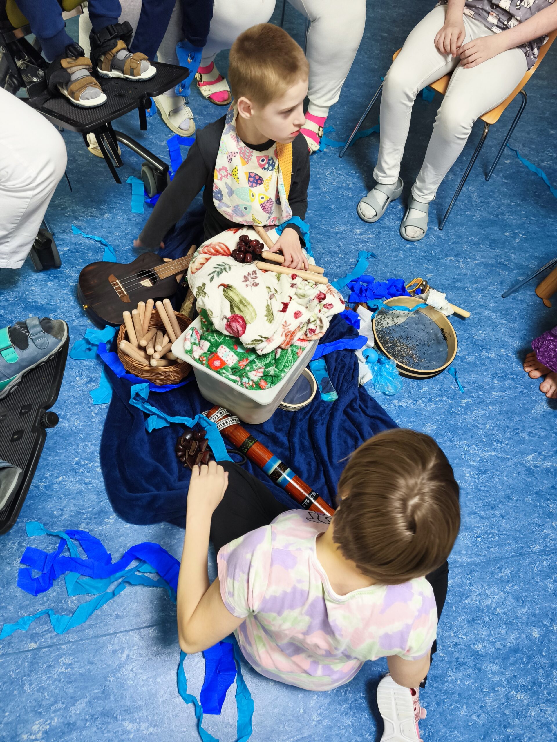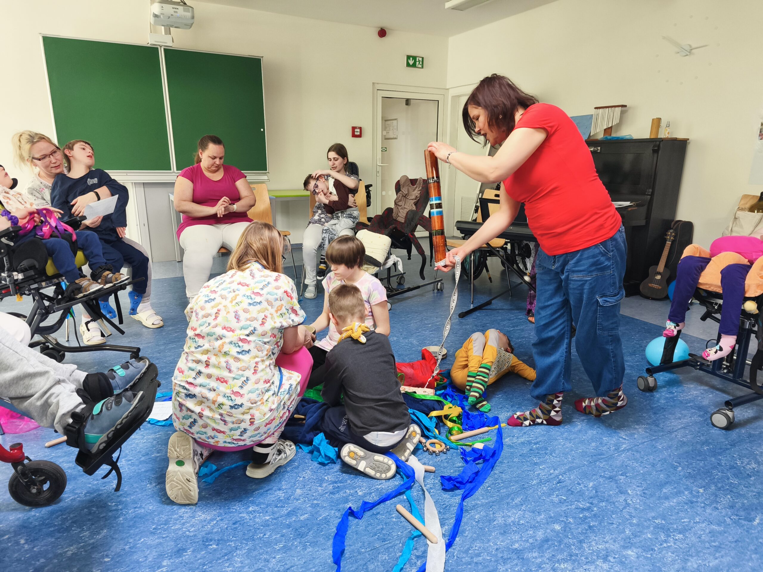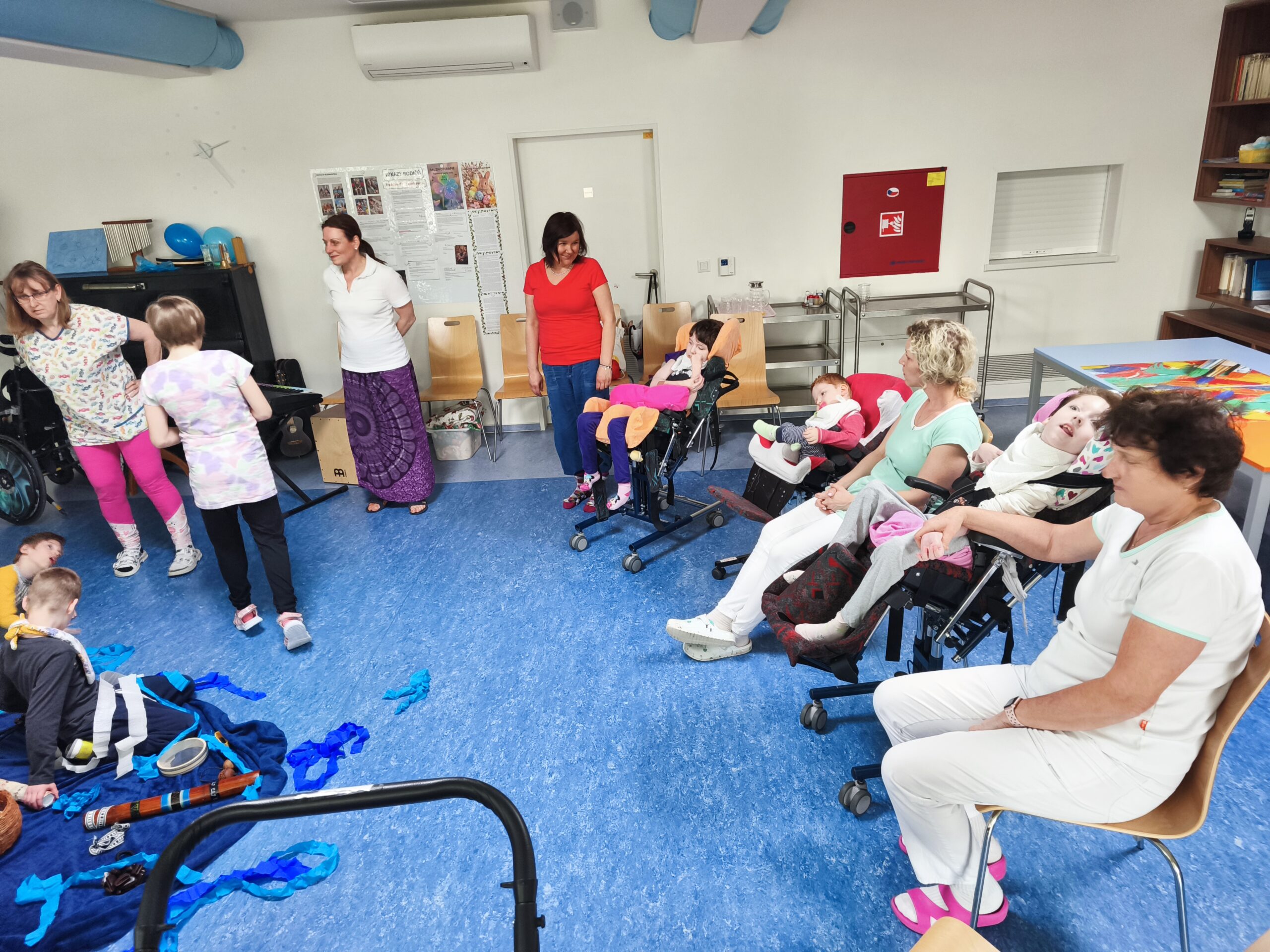 Muzikoterapeutky přinesly nový hudební nástroj – dešťovou hůl. Současně procházely mezi dětmi také se zvonkohrou Koshi. Většina hudebních nástrojů i doplňků byla tematicky zaměřena na motiv vody. Zpívali jsme různé varianty písně „Voda voděnka“. Další aktivitou bylo malování špachtlemi. Na závěr proběhla krátká ukázka relaxace, které se zúčastnila i část personálu.