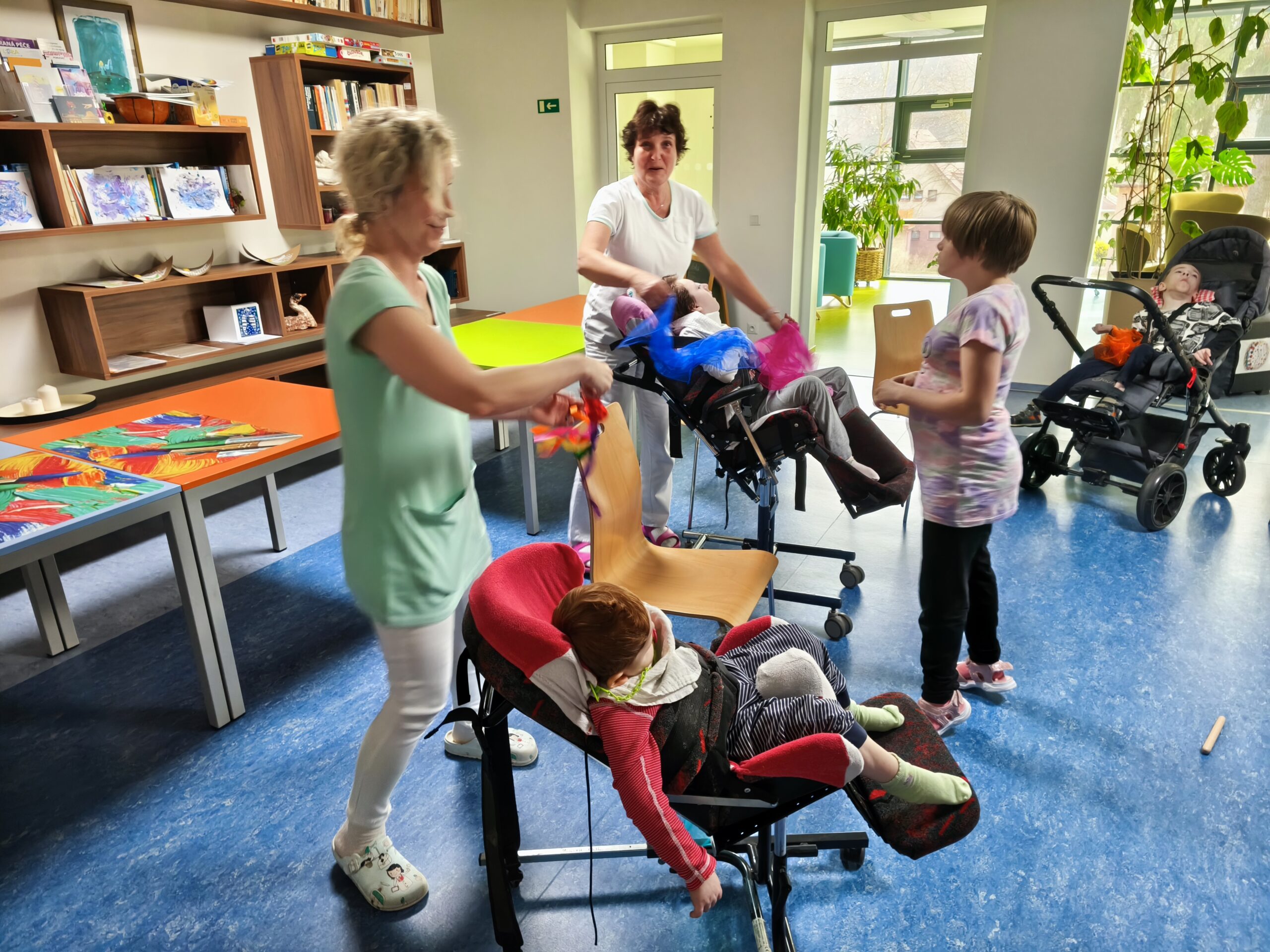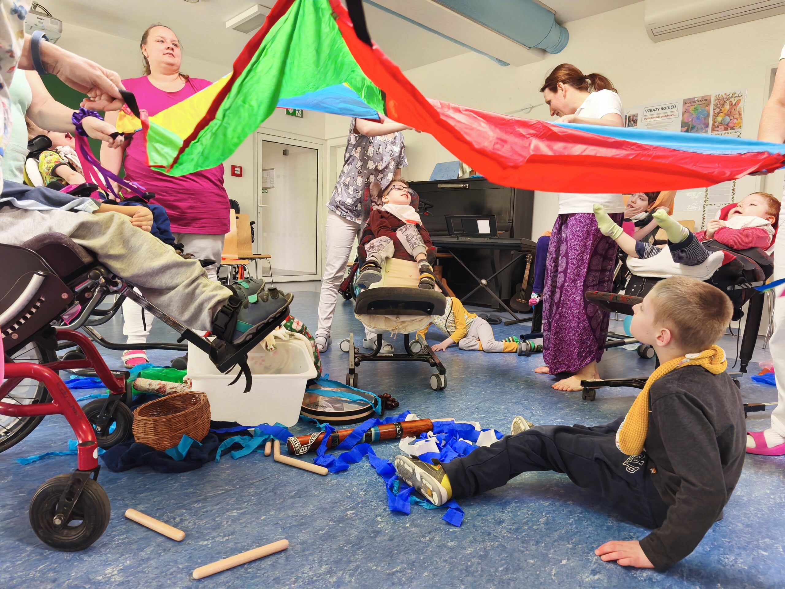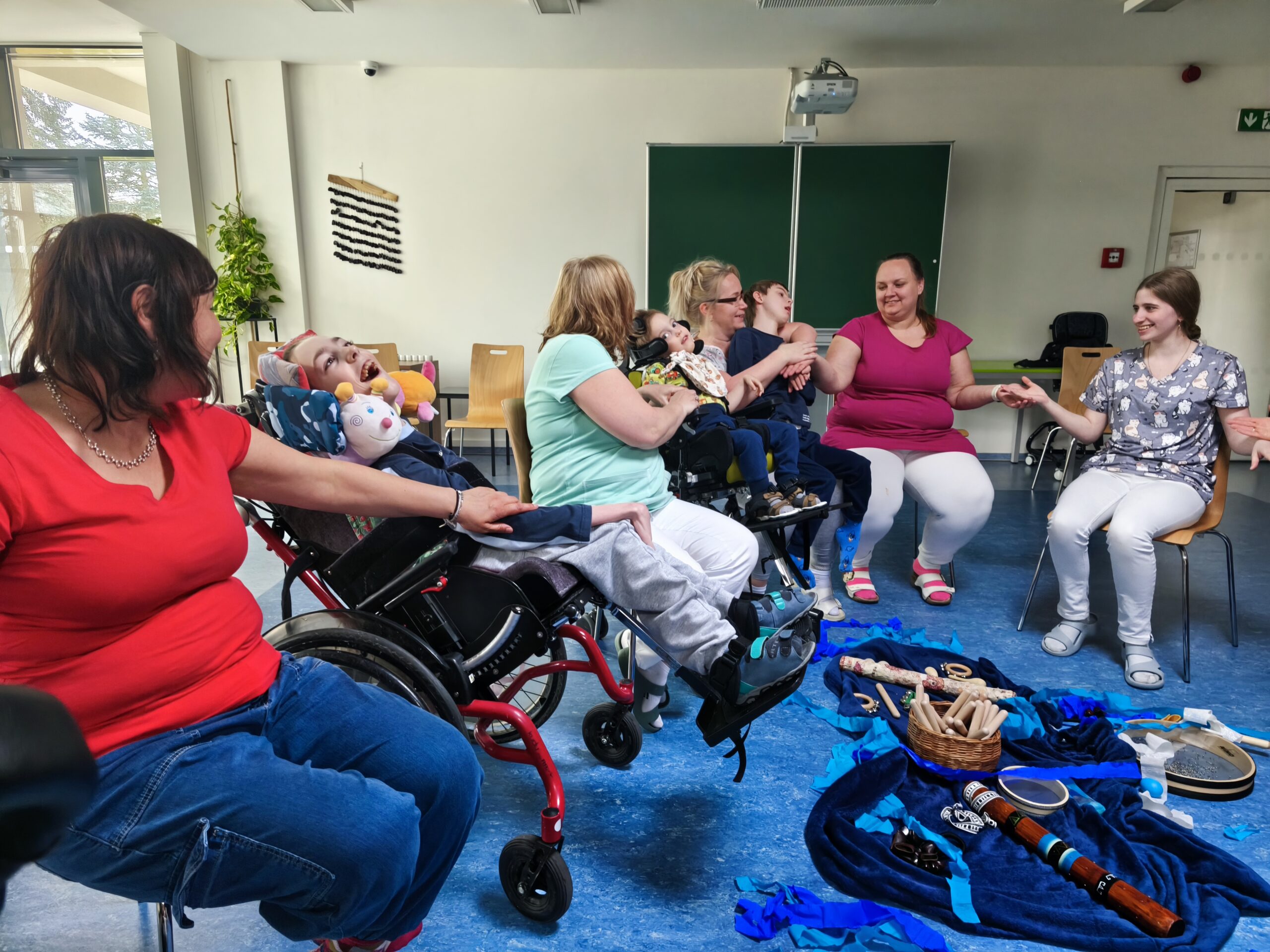 Muzikoterapeutky přinesly nový hudební nástroj – dešťovou hůl. Současně procházely mezi dětmi také se zvonkohrou Koshi. Většina hudebních nástrojů i doplňků byla tematicky zaměřena na motiv vody. Zpívali jsme různé varianty písně „Voda voděnka“. Další aktivitou bylo malování špachtlemi. Na závěr proběhla krátká ukázka relaxace, které se zúčastnila i část personálu.