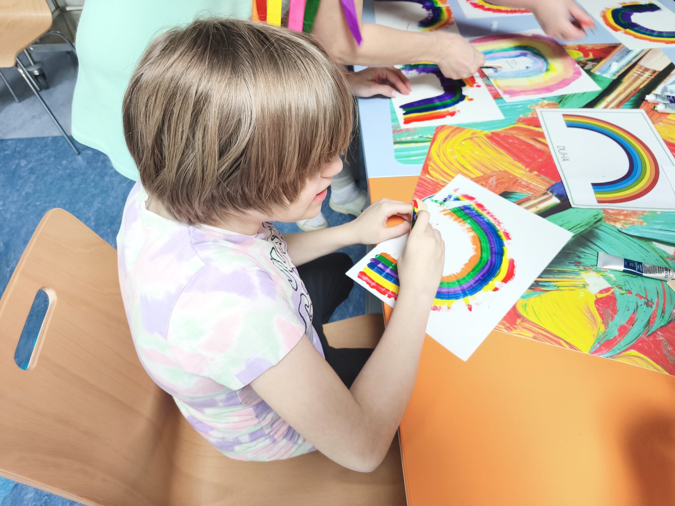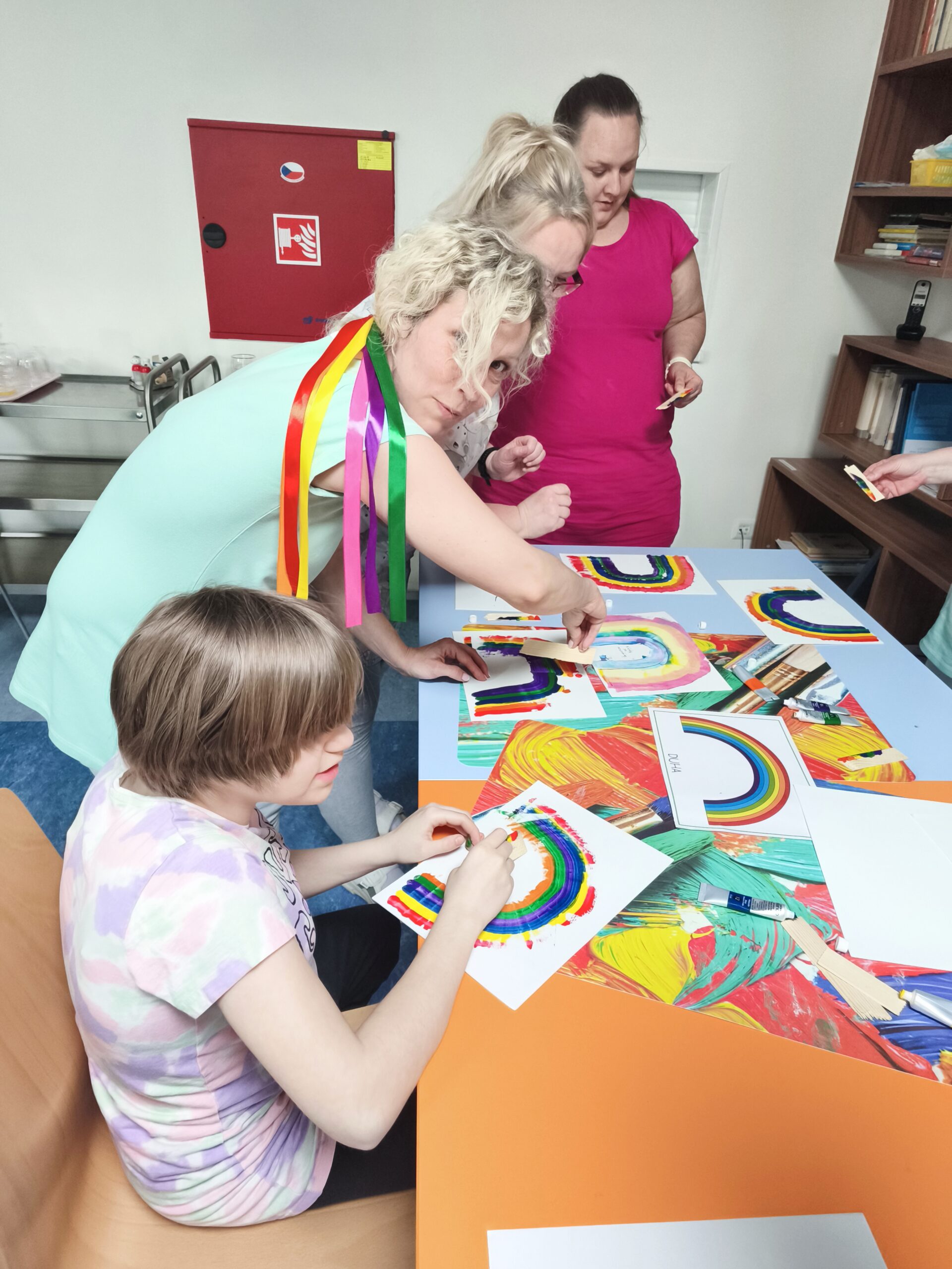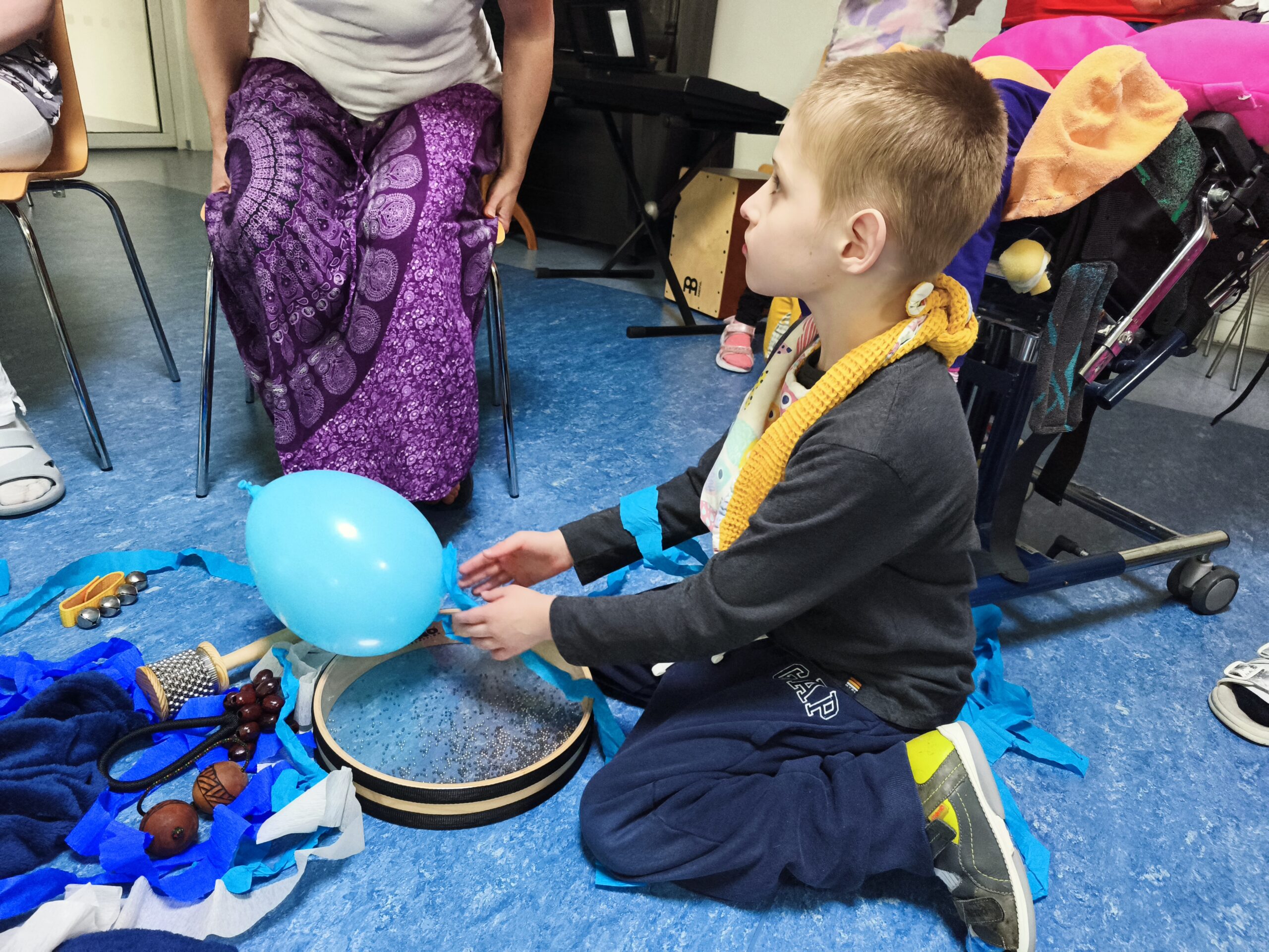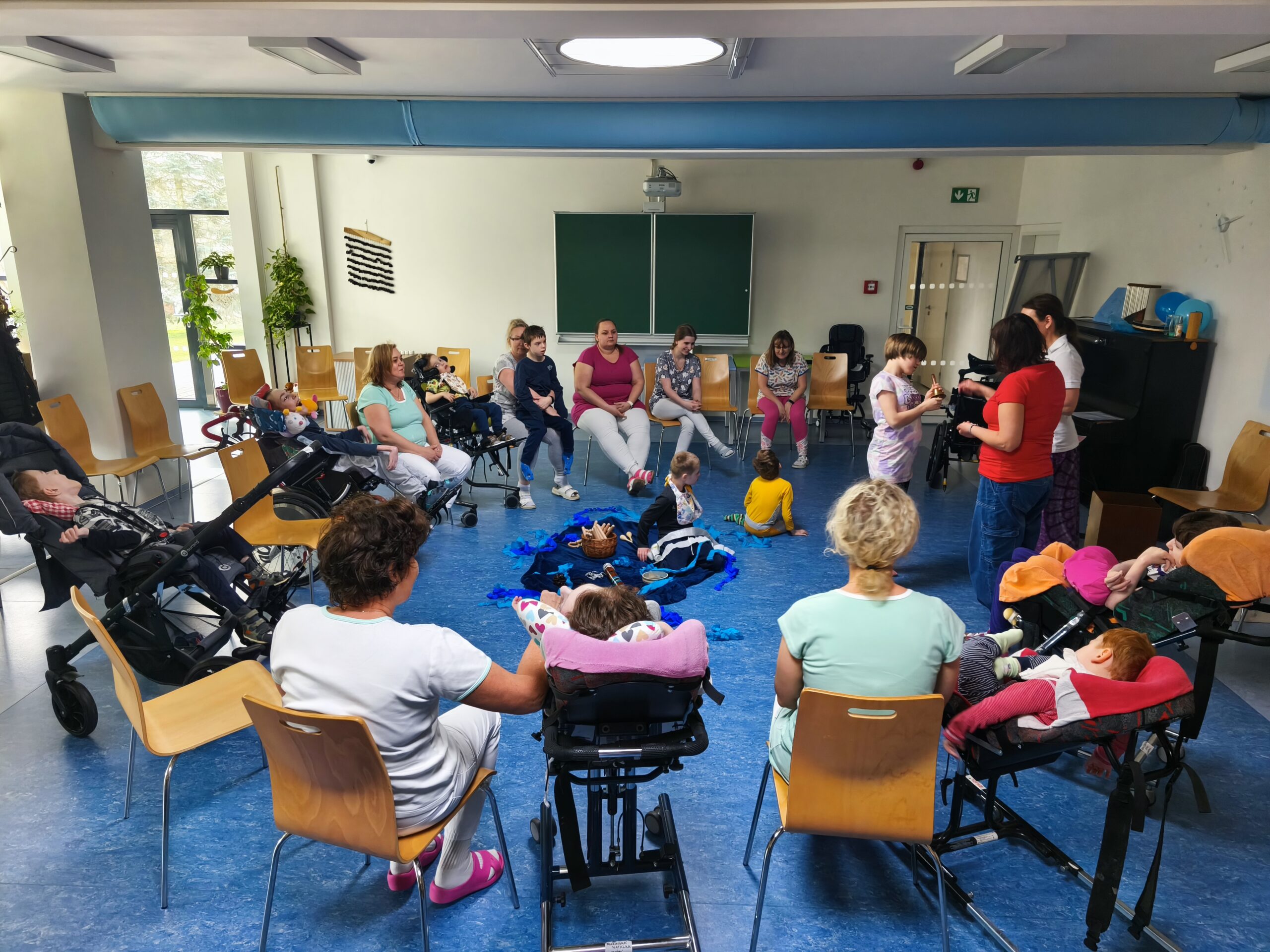Muzikoterapeutky přinesly nový hudební nástroj – dešťovou hůl. Současně procházely mezi dětmi také se zvonkohrou Koshi. Většina hudebních nástrojů i doplňků byla tematicky zaměřena na motiv vody. Zpívali jsme různé varianty písně „Voda voděnka“. Další aktivitou bylo malování špachtlemi. Na závěr proběhla krátká ukázka relaxace, které se zúčastnila i část personálu.