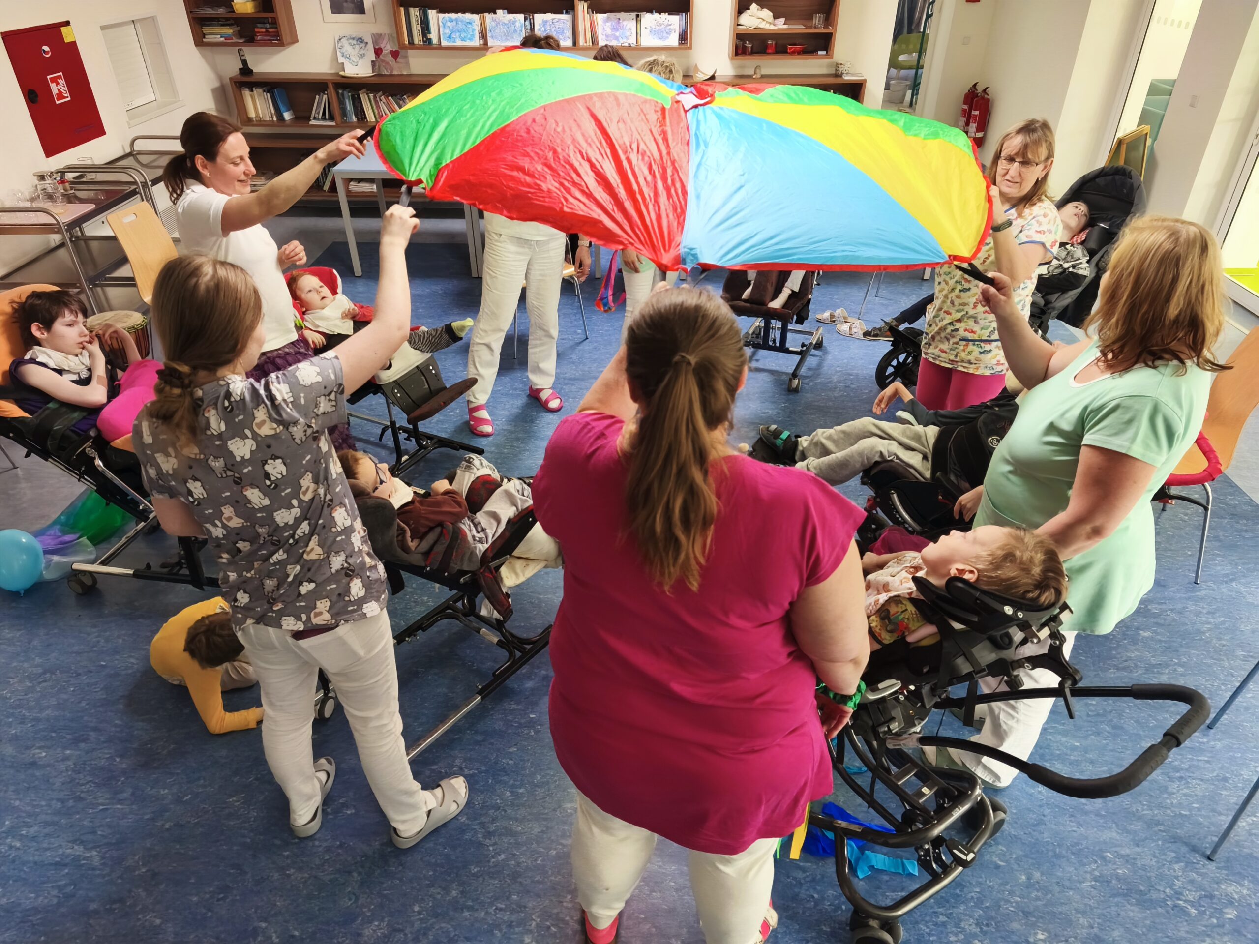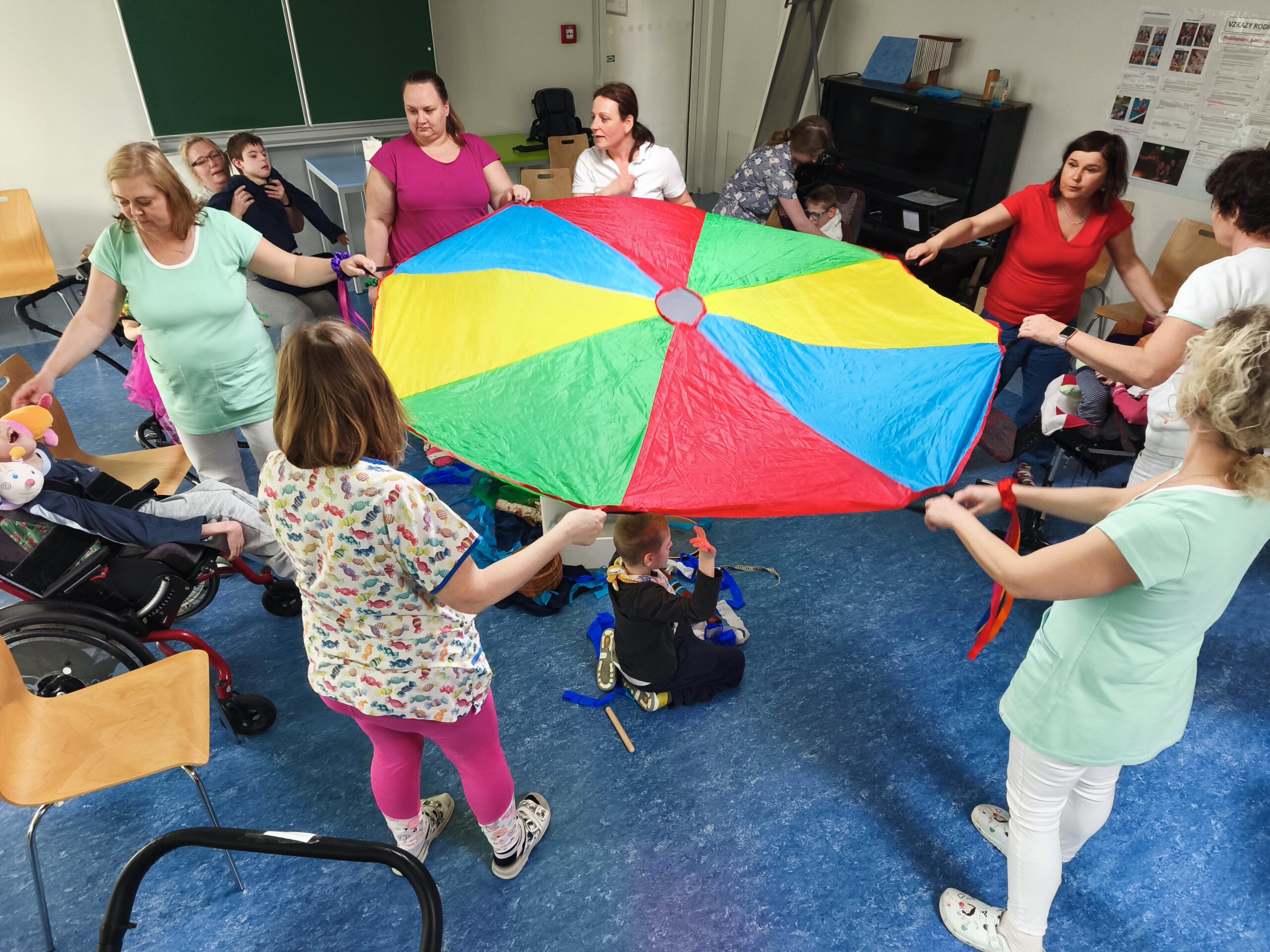Setkání jsme zahájili přivítáním prostřednictvím hry zaměřené na postřeh. Následoval tanec s barevnými stuhami a šátky kolem dětí. Zpěv probíhal za využití barevného padáku, pod kterým si některé děti hrály a se zájmem pozorovaly, jak se padák točí, vznáší a opět klesá.